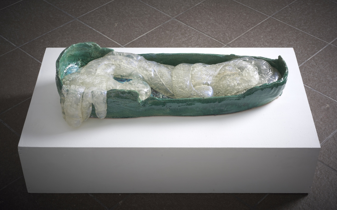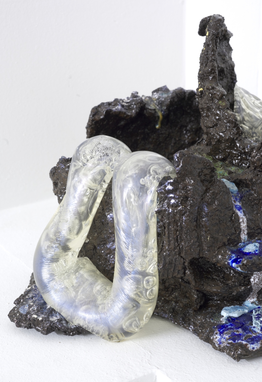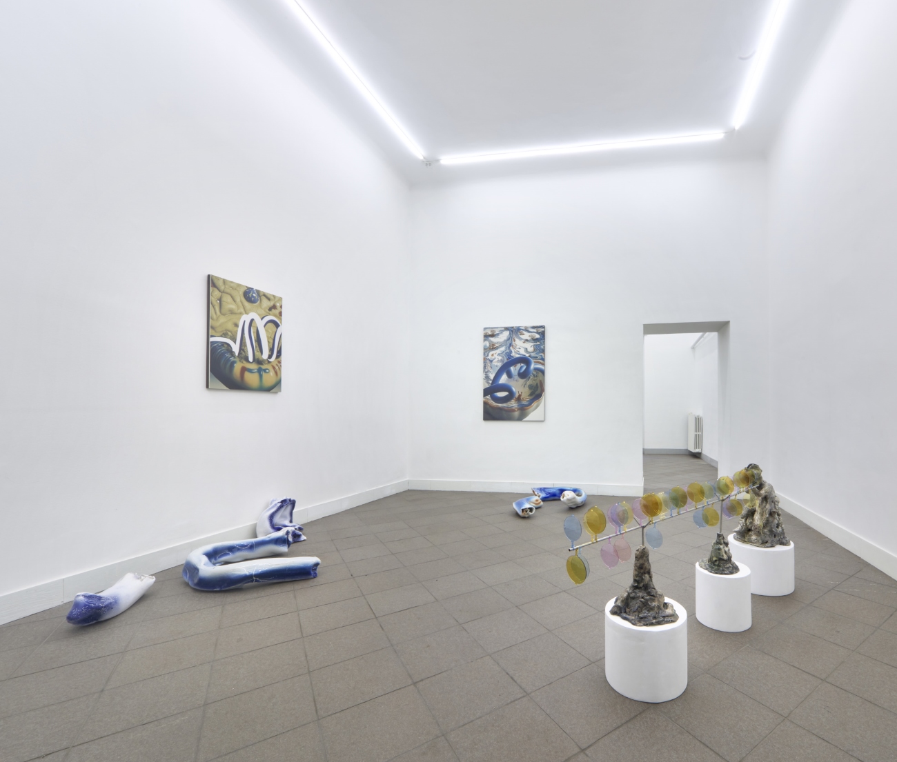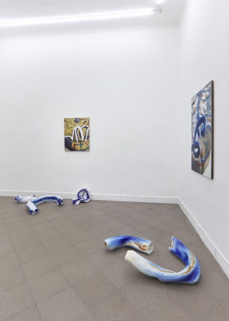 According to an antithetical demiurgic movement, the exhibition concludes with a descent, both physical and evocative, into a proto-vital condition. Fluid, visceral presences recall amniotic liquids in motion: viscous volumes surfacing and emerging from the earth itself. Ceramic castings and acetate forms share a metamorphic dimension, alluding to primordial organisms engaged in an evolutionary trajectory that reaches toward the forms presented on the upper floor of the gallery.