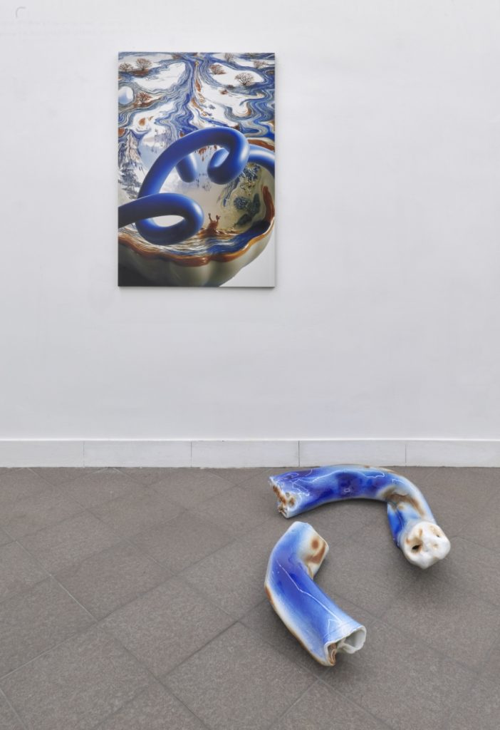 The exhibition spaces host a series of two-dimensional works, real landscapes born from the digital reworking of photographic material captured by the artist in places of age-old tradition such as Nove, a town in the Veneto region renowned for ceramic production, and the Brenta River. Clouds of data, composed of photographs of ceramic artifacts and natural glimpses of the river, are fed to artificial intelligence algorithms. The results undergo a further elaboration process through precise inputs from Ardini, establishing an osmotic flow of thought and sensitivity between human and machine. Thus, the Vedute are born, an homage to the classical iconographic theme, reinterpreted in a contemporary key and presented as photo-ceramic prints. Each of these works is accompanied by one or more amorphous elements, refractory extrusions that surface from the flat plane, emerging like breaths to inhabit three dimensional space. The Diatomee, fluid bodies evoking a suspended dimension—are constitutionally hybrid images, taking form like the dream of a machine becoming matter.