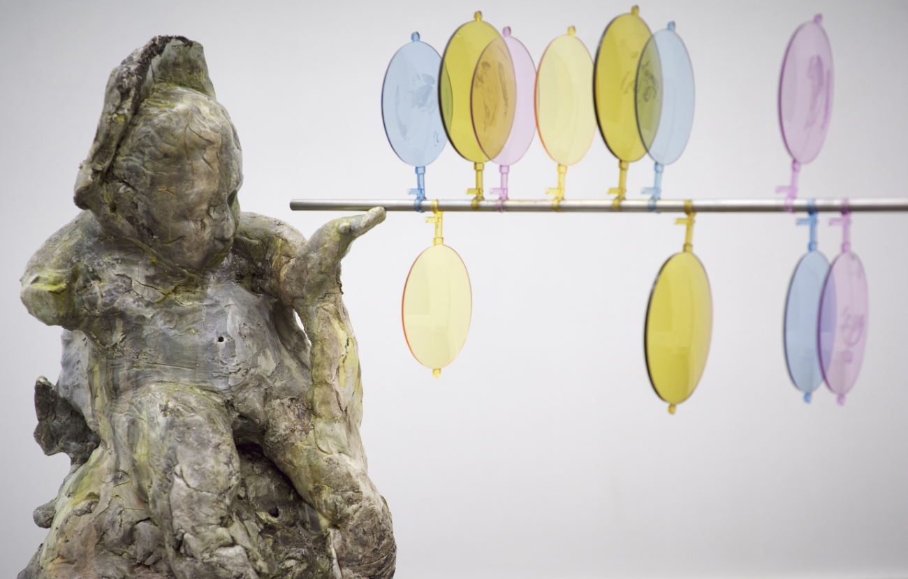 The exhibition begins with the work Mercurio (2025). Through a reciprocal exchange of gazes, a relationship is established between the work and the viewer, who, upon crossing the threshold, is struck by the irradiated and ethereal vision of the small-scale sculpture. The forms are skillfully modeled to render a figure with anthropomorphic features, an archetypal presence that metaphorically supports its own gaze. A series of ocular lenses give rise to a play of reflections, a silent dance marked by the alternation between the visual agent and the object of the projection. The work suggests a holistic conception of vision, in which matter, light, and color exist in an interdependent condition.