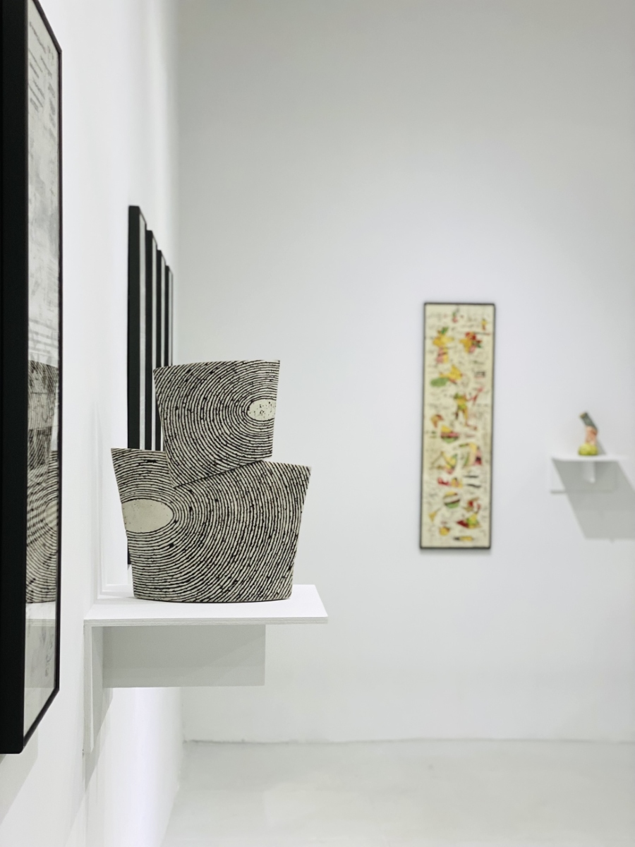 This exhibition brings together two artists and their respective passions for the ancient material of clay and the more modern practice of mark making on paper. For 39 years, Rosaire Appel and Robert Ellison shared both a home and a life filled with art and curiosity. For Ellison, this led to a lifelong pursuit of collecting, learning about, and making ceramics, as well as photographing and writing books about ceramics. For Appel, her experience with the limitations of the written word and its representation led to a practice of asemic mark-making in drawings, prints, and artist’s books, where the meaning is left up to the viewer to interpret, decipher, feel, and puzzle over. In their shared living space, works from the collection mingled with those created by Appel and Ellison, existing in regards to one another. This exhibition pays homage to that interaction, while also celebrating the discrete voices of these two remarkable artists.