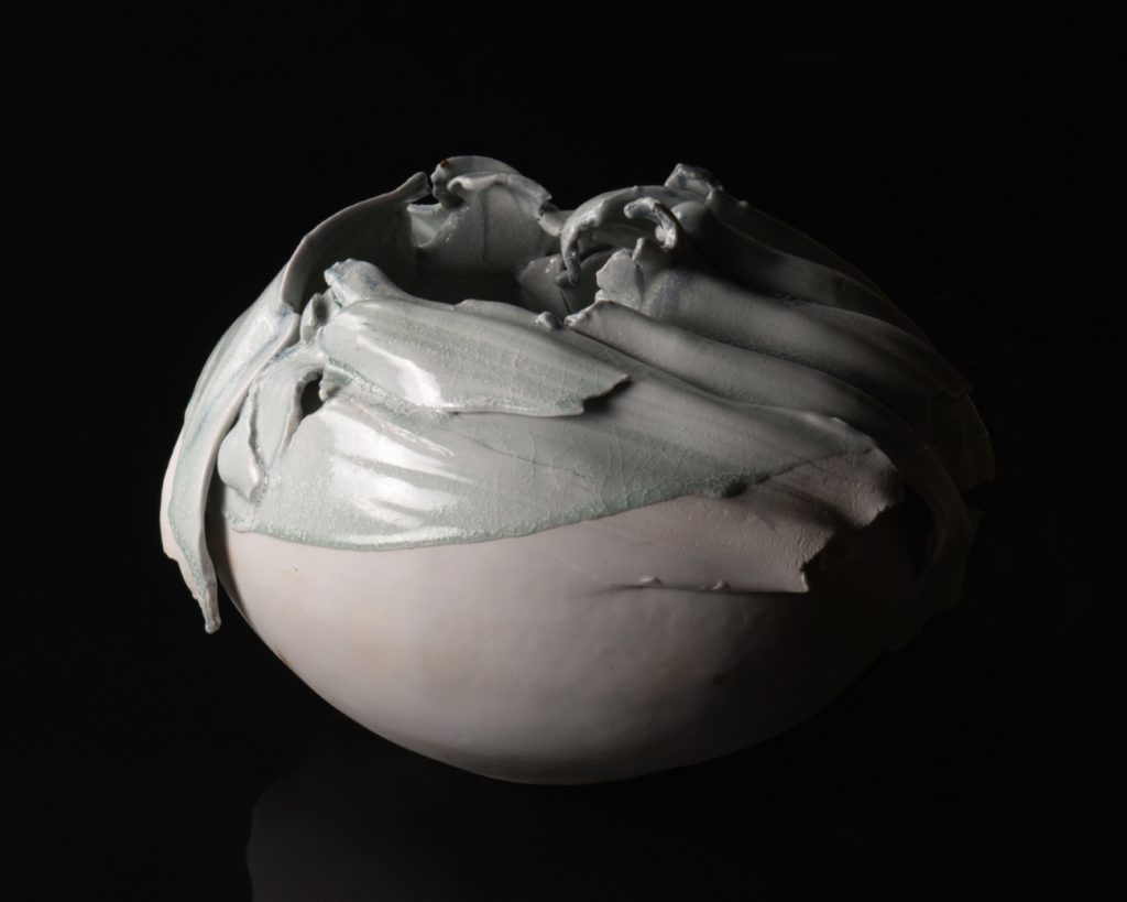 For Kato, this philosophy of interior presence also extends outward into form: the vessel’s “soul” finds further expression in textures and surfaces that invoke potent themes from the natural world. Working primarily with sheets of porcelain clay, Kato constructs sculptural forms that echo glacial terrains, quarried mountains, or oceanic tides. Her process is defined by formal tensions between sharpness and softness. Delicate slabs and ribbons of porcelain clay are layered, folded, and draped to achieve structure while still retaining organic fluidity. Under shifting light, the surfaces of her works comprise crystalline tones and dramatic, angular shadows that impart an ethereal impression on the viewer. Subtly iridescent glazes, in pale greens and blues, emerge through the matrix like glacial melt over porcelain, recalling distant and celestial terrains. The making is meticulous: hand-building, painting, glazing, drying, before finally firing in a gas kiln.