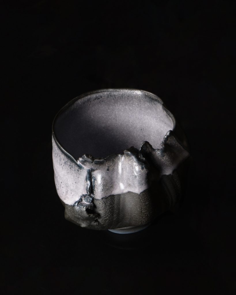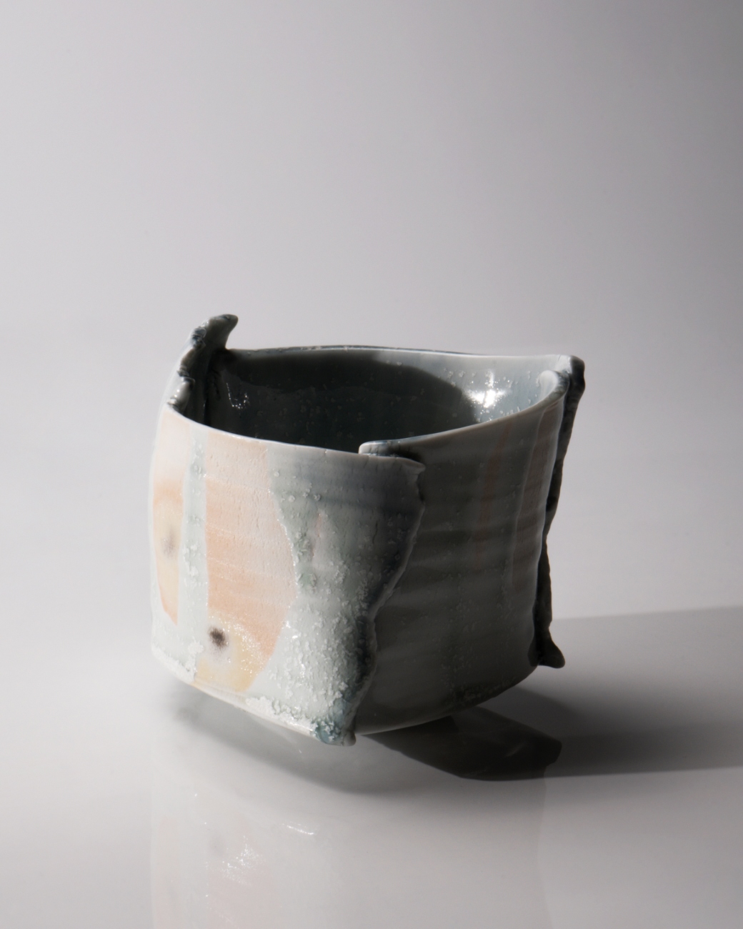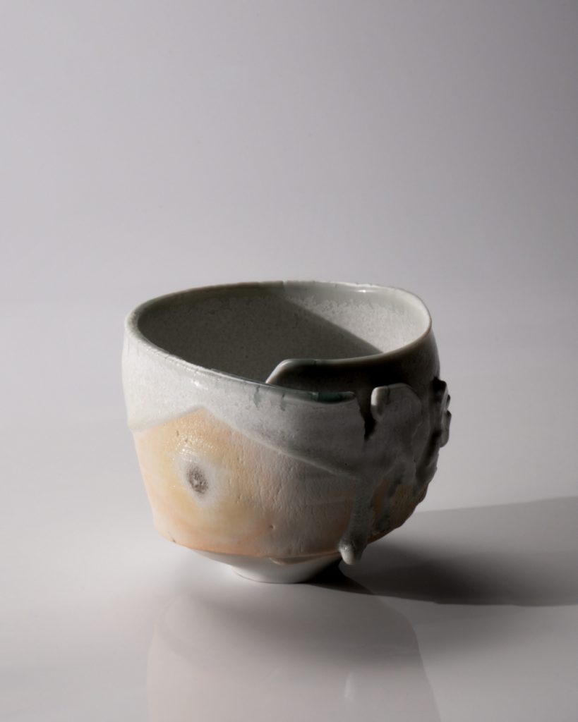 “This tea bowl was formed by draping a slab of clay over a mountain-shaped plaster mold. Where the slabs overlap on the body, they are slightly misaligned and crimped, creating a distinctive nuance unique to the artist. These subtle distortions lay bare the internal structure of the vessel, posing the question: What is a vessel? In this way, the artist imbues the work with a deeply personal reflection. It becomes, in a sense, a space through which the self is released.”