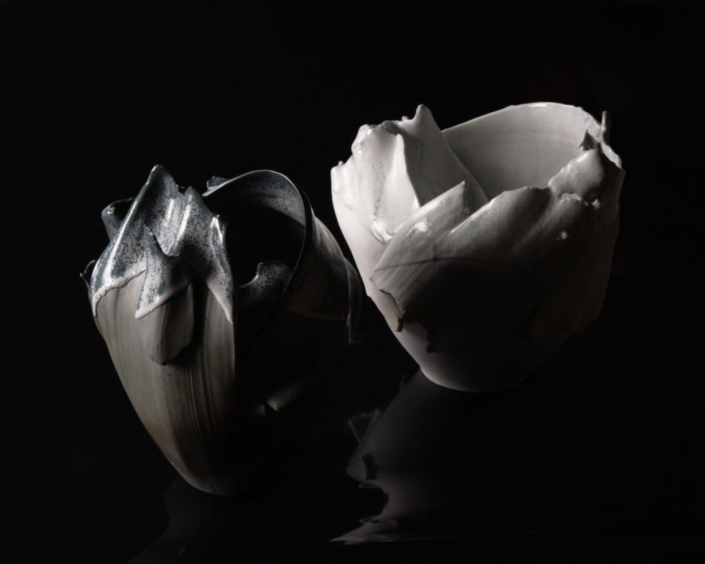 - Two works by Kato Mami #2, (Left) Tsukuyomi (Moon reading), 2025, Seto porcelain, (h) 29.5 × (w) 23 × (d) 22 cm / (Right) Gekka (Under the Moon) 2, 2025, Seto porcelain, (h) 26 × (w) 29 × (d) 26 cm. Photography by Yoriko Kuzumi