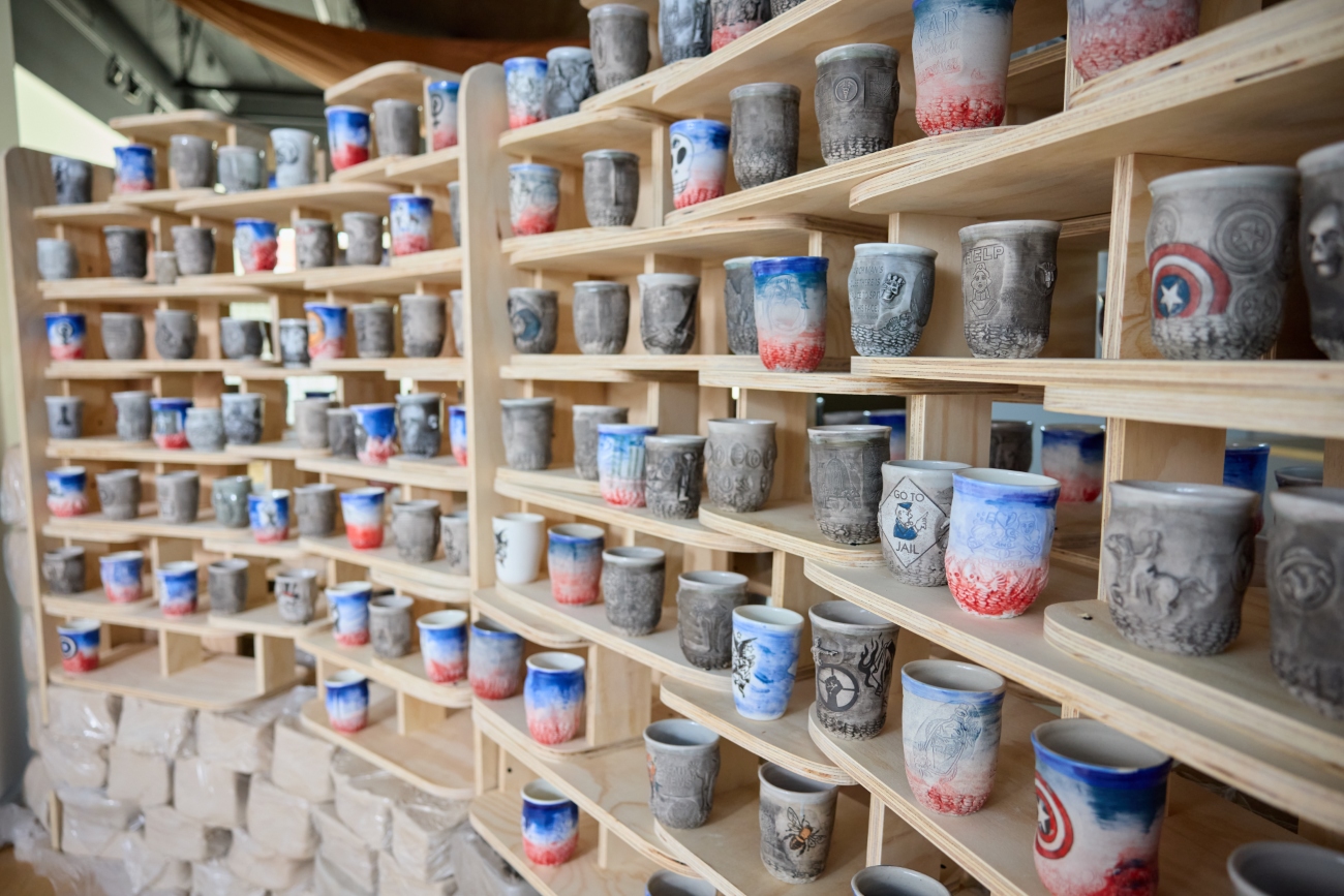 At the core of Clay as Care is the work of Adebunmi Gbadebo, Jennifer Ling Datchuk, Maia Chao, and Ehren Tool, groundbreaking artists who are addressing care, healing, rest, and resilience in their work. These artists acknowledge and access qualities of care for themselves in making their art, and therefore communicate aspects of care to their audiences. Gbadebo harvests clay from the plantation where her family was enslaved, and uses it to create vessels as an act of healing for the memory of her ancestors. Datchuk creates work with images representing her journey with fertility-related medical procedures and builds spaces for contemplation. Tool, a military veteran, has made over 26,000 cups during his artistic life and says that his “process is therapeutic—and the cups are a kind of catharsis in clay.” In addition to the artists, co-curator Nicole Pollard, our Community Exhibition Council, members of the care movement, and scientists researching the connections between art and care have come together to explore how to offer the visitor ways to engage in acts that combine clay and care within the gallery. The planning process brought these individuals together to learn from each other and explore ideas that break down hierarchical structures present in many art viewing environments. The exhibition pushes beyond traditional methods of displaying art to create new systems of engagement for visitors that include viewing, creating, and resting.