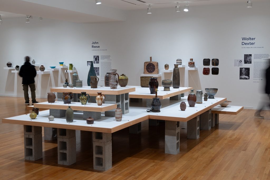Around the periphery of the gallery are eight spotlight displays featuring the artists that Lawrence was able to collect in depth. These displays have been managed differently, using profiles of the work to show off form and glaze, with a short precis on each artist. The earliest studio potter in BC, Axel Ebring, had been trained in Sweden by his father and grandfather. He arrived BC in the late 1900s, and by the mid 1920s established his first pottery in the interior of BC. It is hard to convey to those outside of British Columbia, the type of terrain, the isolation, and the challenges this location would have presented in that era. There were no commercial or traditional ceramic resources whatsoever, and a drive to Vancouver, the closest sizable city, 450 kilometers away, in a cart or car, would have taken many hours, even days, hampered by broken wheels or flat tires, in unpredictable weathers, and on questionable unpaved, and scary mountain roads. Ebring had to find and manufacture all of his own materials and tools, so he located his workshop near clay and mineral deposits. Another notable aspect of his practice is that he was well established long before the pervasive Leach/Mingei and Modernist influences, especially those from post WWII to the 1970s, had infiltrated much of the studio pottery of the Western world. Consequently, his handsome, vintage forms and lustrous glazes, many of which are lead based, do stand out. In contrast, the pottery of two other spotlight artists, Ontario born, John Reeve, and British Columbian, Charmian Johnson, both Leach apprentices and acolytes, are all about interpretations of Leach/Mingei. The pottery of Wayne Ngan, who arrived in Canada at age 13, elegantly moves through an intersection of influences – Asian, Leach /Mingei, and Modernism. Laura Wee Láy Láq, one of BC’s earliest Indigenous ceramic artists, of Stó:lo (Coast Salish) and Wuikinuxv (Oweekeno) ancestry, focussed on organic form, using coiling, burnishing and pit firing to beautiful and meaningful effect. Albertan, Walter Dexter, who trained in the prairies with Luke Lindoe, and then in Sweden, and Vancouverite, Kathleen Hamilton, both demonstrate the influences of modernist rigour and Scandinavian design. Thomas Takamitsu Kakinuma is represented by his much -loved animal figures. Kakinuma arrived from Japan, in 1937, but it was in the 1950s he acquired his ceramic skills, in both Ontario and at the Ceramic Huts at the University of British Columbia.