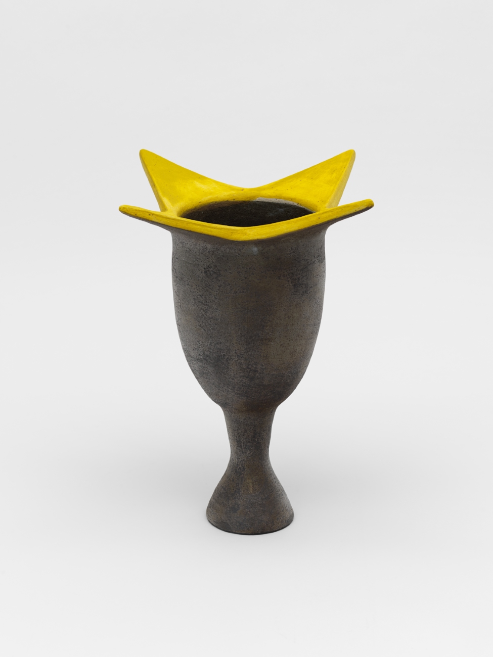 - Wayne Ngan, Sculptural Vase with Lugs and Yellow Rim, 2010, Stoneware, 15 3/8 x 9 7/8 x 4 in, 39 x 25 x 10 cm. Courtesy of Wayne Ngan, Studio and James Cohan, New York. Photo by Dan Bradica.