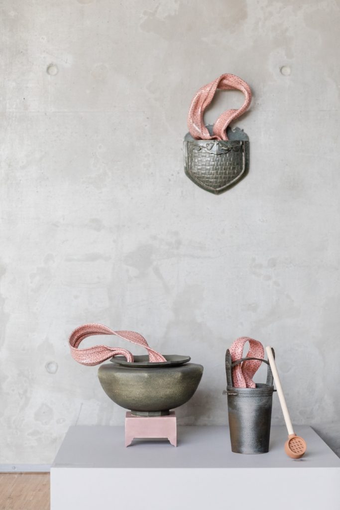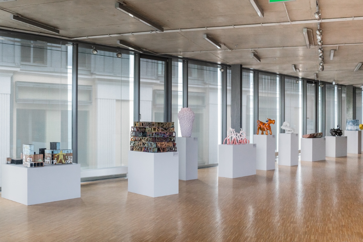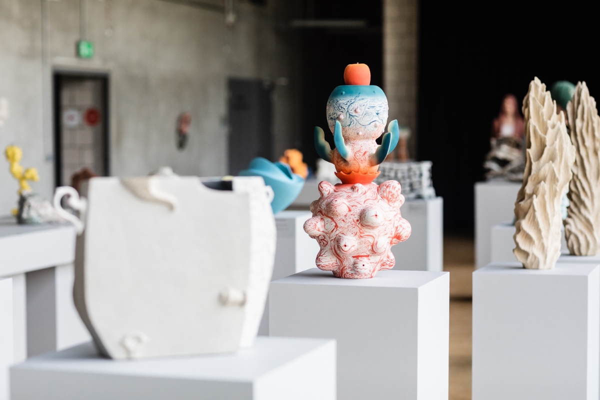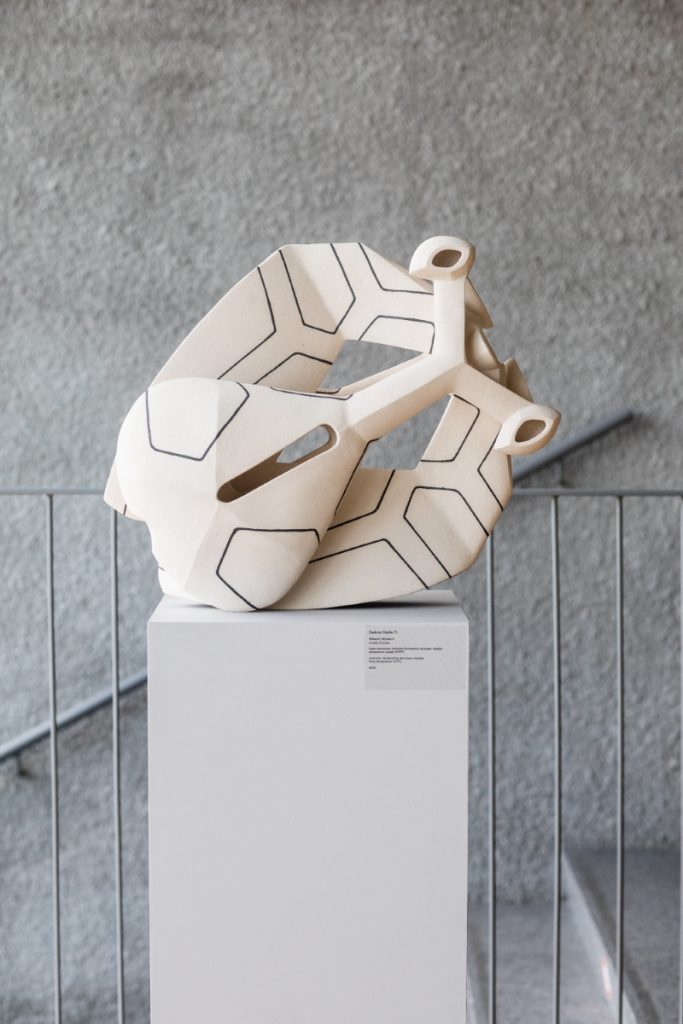 Hanna Miadzvedzeva created her own technique of producing forms from slip, with her sculpture Storm reminiscent of a thundercloud billowing low overhead. In terms of contextual engagement, a sculpture that particularly stood out, was the creation From the series War by Czech artist Robert Buček, who paints representations of war in the style of children’s drawings on prefabricated ceramic segments. The destructive impact of war is further emphasized through the use of the raku method. Childhood is also referenced, though differently, in the works Mumu model Voodoo by Mariusz Dydo (Poland) and JOY by Marta Olejniczak (Poland).