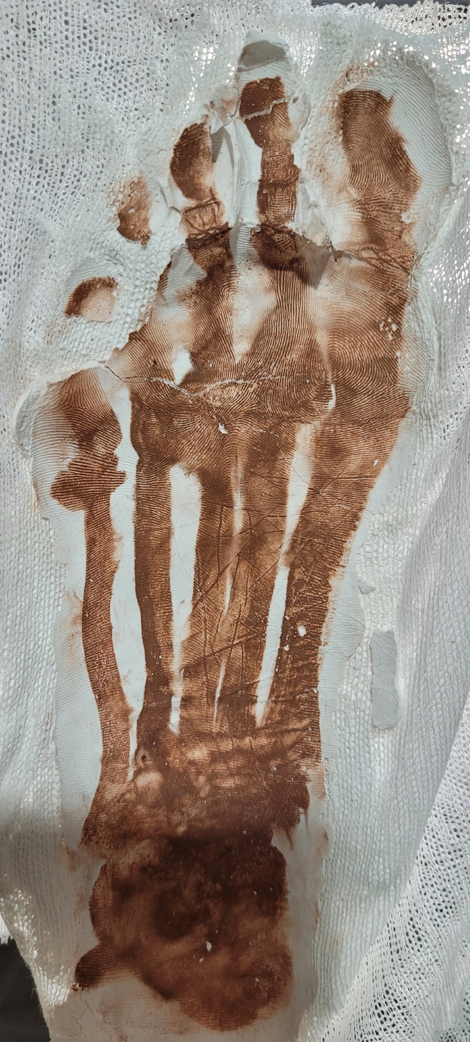 The approach to expanded ceramics, the review of contemporary artists who work with this resource, the questioning of the imperative of the kiln or the use of closed knowledge about processes and combinations of materials, the experimental stance, as well as the attention to matter, the body, and the context triggered processes that I incorporated into my research/production. The productions of the project The Body as Territory speak of a female body, an earth body, a fertile body (maternal and erogenous) and value their existence as it is. A body that expresses itself and creates, and that in creating becomes something else: Earth, clay, territory, universe. They speak of the place where I live, the land of potters and bricklayers, the place of sun, valleys, mountains, and volcanoes. The action of lying down on clay soil and digging my silhouette, that is, using the body as a matrix, and the footprint as a mechanism to record the territory, denote a body-matrix materiality, which is feasible to be used to influence other supports. The support is the territory itself, the soil that is clay, ceramic material where one traces and incises. The result is a ceramic-graphic, gestural and ephemeral piece. (photos 4-7)