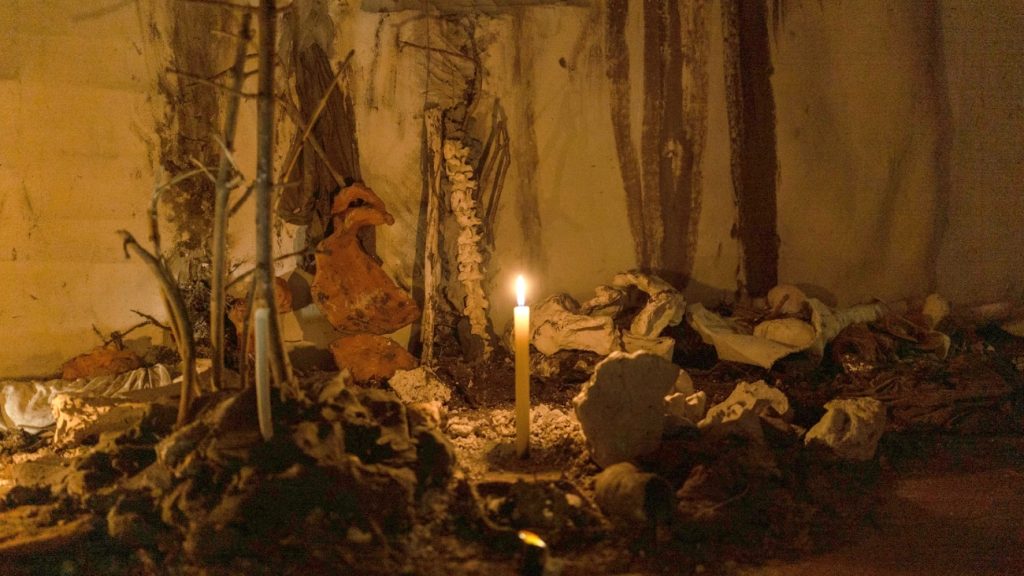 Varied materials such as clay, plaster, a dead plant, branches, Earth, Ceramic bones, snails, stones. The words in poetry, performative improvisation, nonsense, the animal, the sensation, the ritual, the non-representative. Everything appeared and brought new questions about life and death. A laboratory of meanings that exchanges the poetic and the scientific. Lights and shadows, ceramic minerals, work processes that poetize what nature does with matter in a journey without origin or end. (photos 1 – 3)