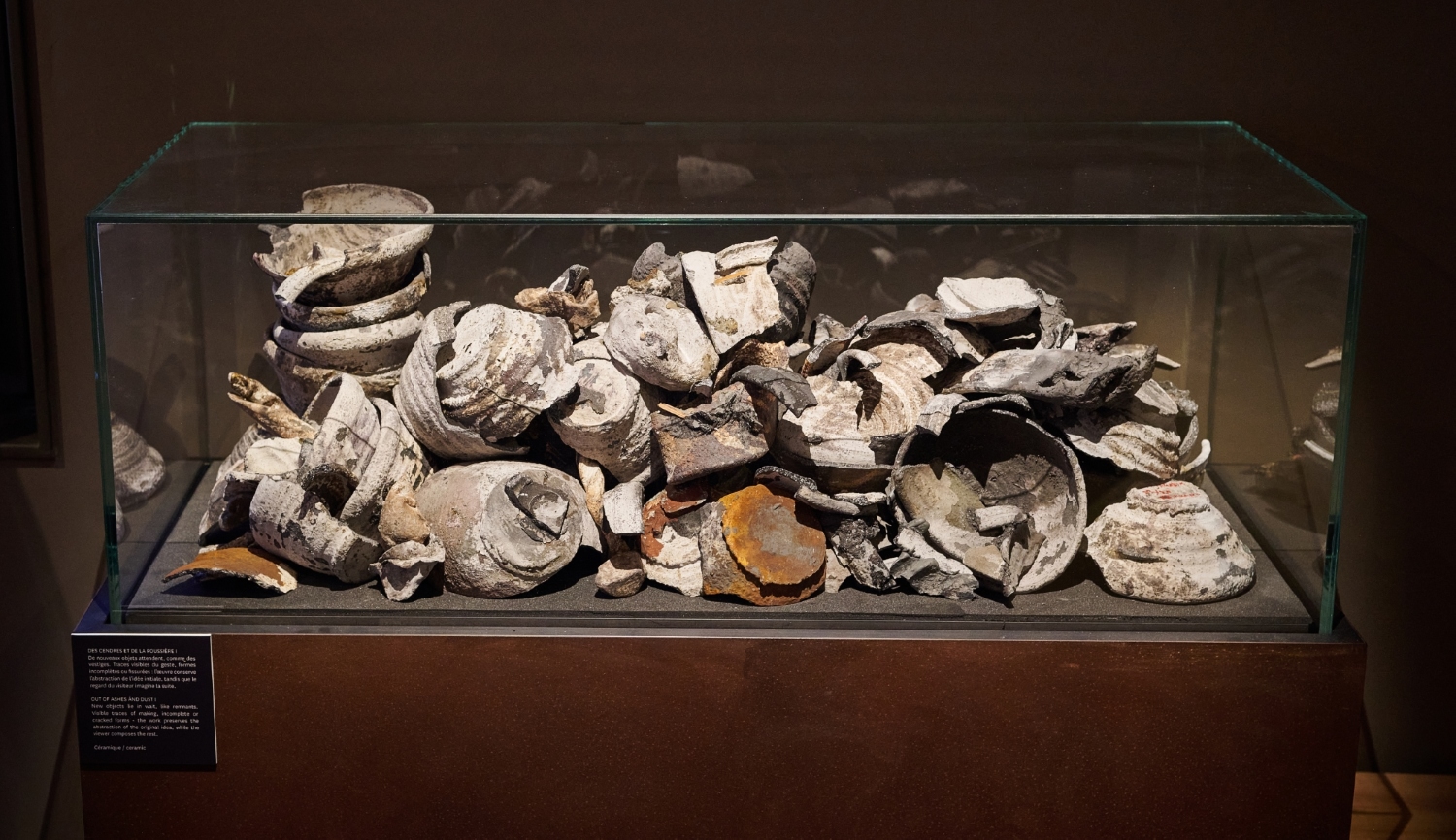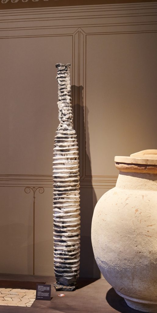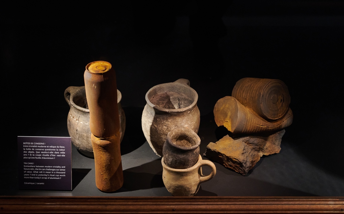 The exhibition is deliberately divided up between the main temporary exhibition room and the rest of the Museum, with here and there the installation of different monumental assemblages echoing those of the Museum, while throughout the different rooms small poetic proposals are set in showcases. Elsewhere, the artist places sculptures that cleverly take up the theme of the contents of the showcase, which he is only temporarily replacing. This is indeed his project, first to confound the gap of centuries and then to put the spectator before the obligation of a real commitment to his own perception, to decide where the value really lies. Is this carefully preserved and restored everyday pot from some two thousand years ago really more interesting, more culturally charged than this ceramic can that could be unearthed in the distant future?