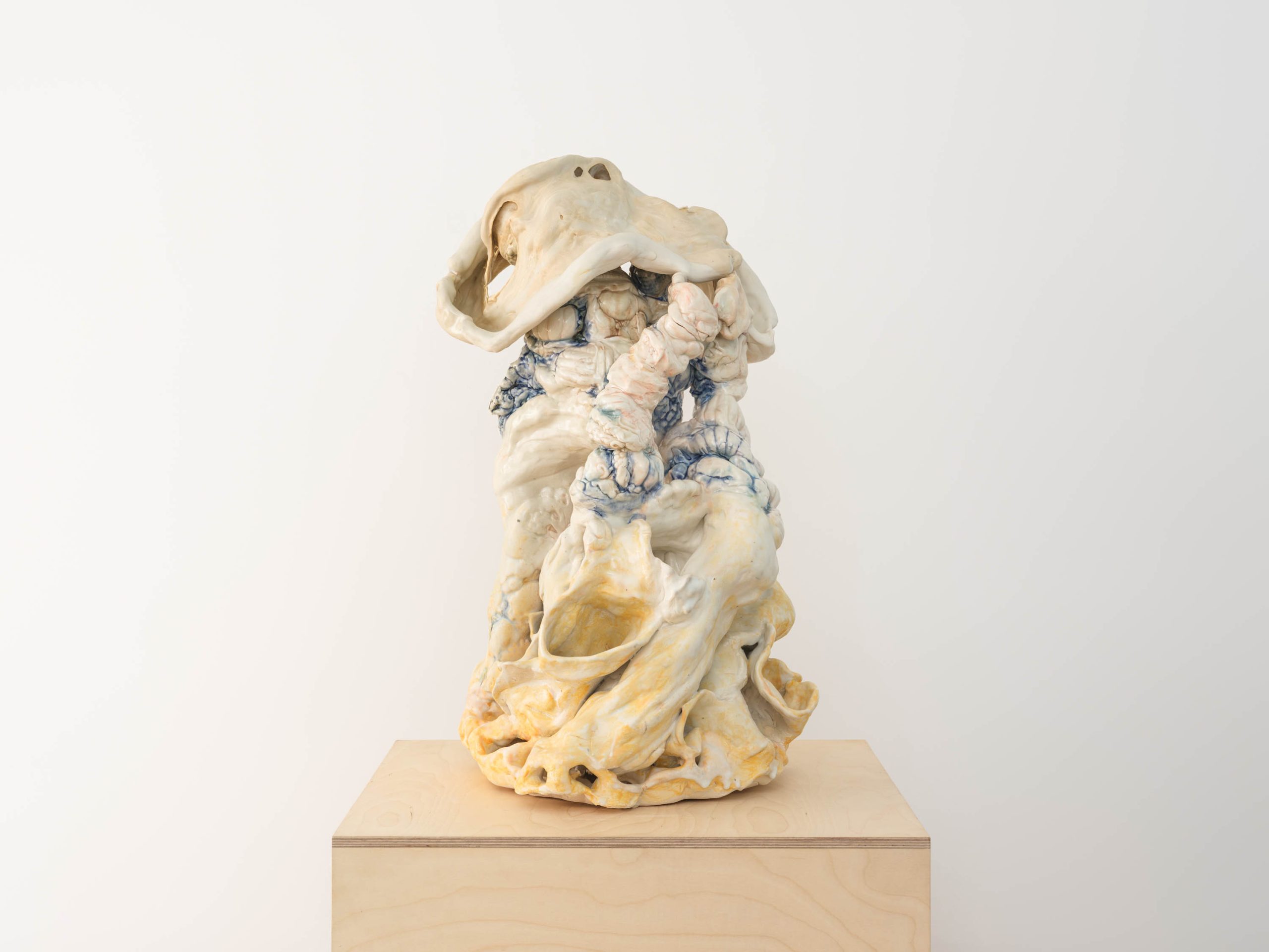 The exterior surfaces of many of the artist’s ceramics are produced through a succession of impressions. Forms are cast from an archive of plaster mother molds that Nordli collected over the years. These range in subject matter from traditional and personal to popular and kitsch: mass-produced figurines, precious or impudent animal figures, neoclassical columns and Greco-Roman statuary, and anatomical casts taken from life, to name a few. To begin each vessel, Nordli presses portions of the clay into those molds, the surfaces of which transfer the delicate textures and fissures of the original object. The impressions are then arranged side by side and sutured to one another through the extraordinary malleability of clay, buttressed with coiled ropes of clay. She continues in this way until the desired height and complexity is achieved. Her process then begins in earnest, abstracting and reworking her subjects until they become something unfamiliar, torqued, infinitely folded. Once glazed, the final form is replete with internal interrelations, unforeseen combinations, and chimerical embellishments. “My sculptures are made of parts, fragmented. Fragility is something I want to stress,” she says.