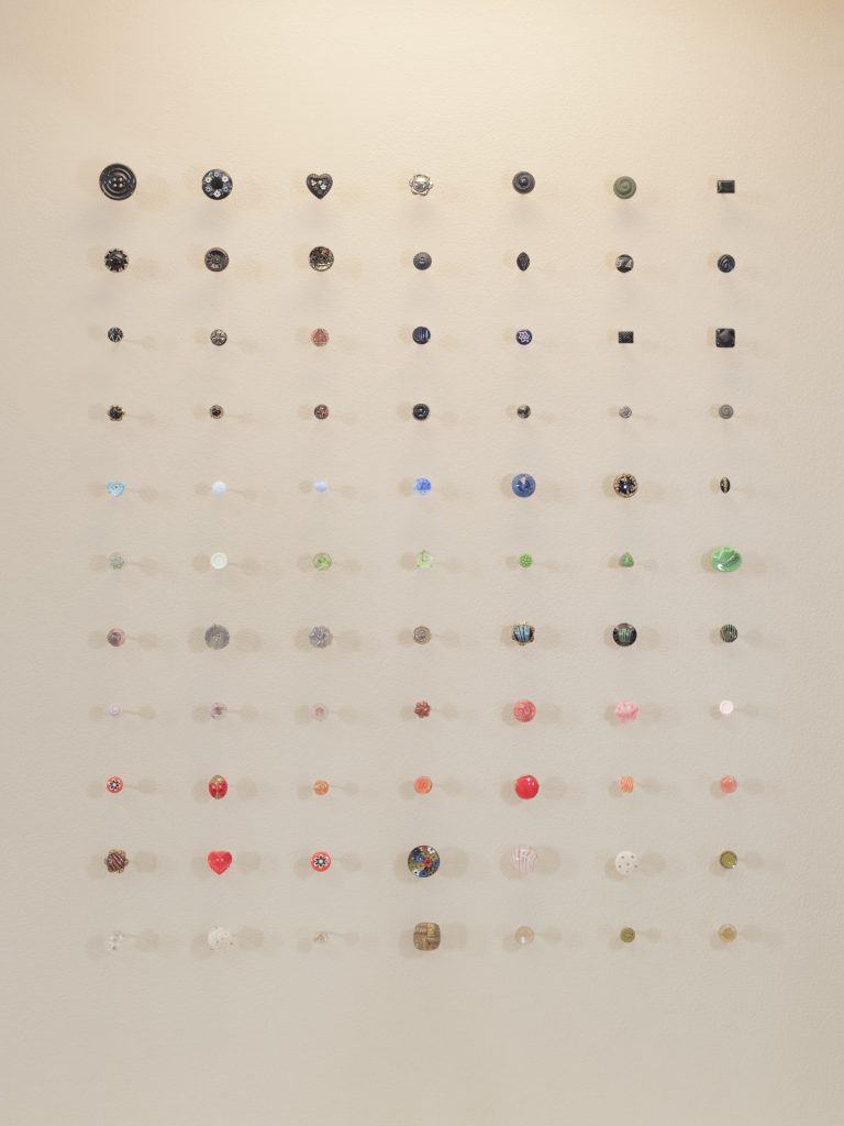 Buttons emerge here as vehicles of formal experimentation, but also as instruments of survival, identity and collaboration. The often-overlooked social histories of these everyday objects are highlighted through a scenography by Lucie de Martin, inspired by the architecture of 19th-century shopping arcades – a key period for the industrialisation of porcelain and glass buttons.