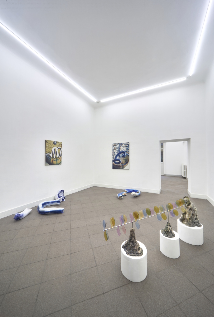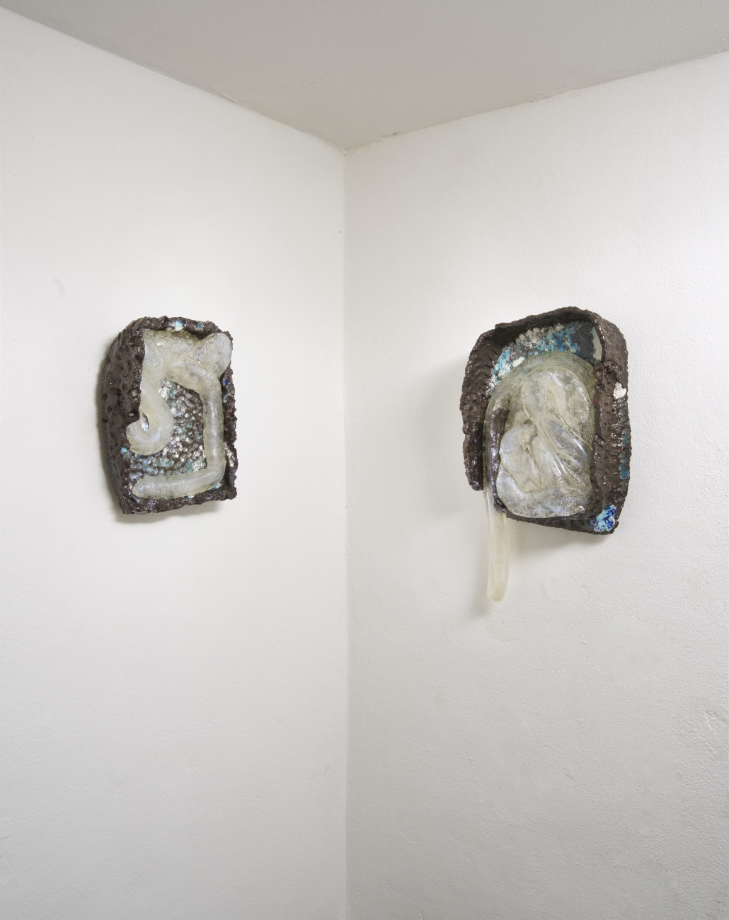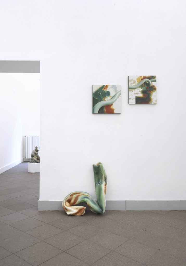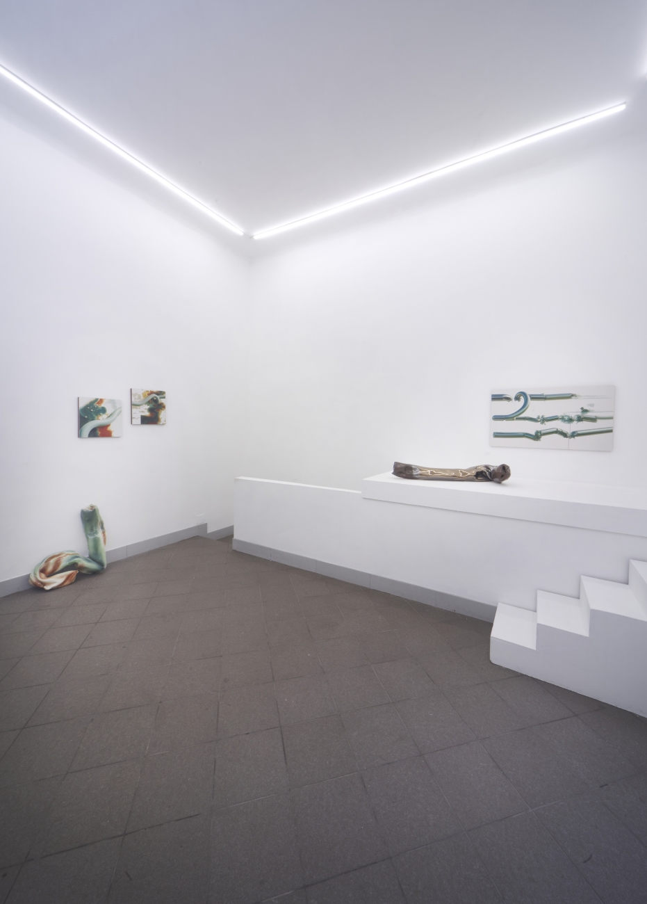 According to an antithetical demiurgic movement, the exhibition concludes with a descent, both physical and evocative, into a proto-vital condition. Fluid, visceral presences recall amniotic liquids in motion: viscous volumes surfacing and emerging from the earth itself. Ceramic castings and acetate forms share a metamorphic dimension, alluding to primordial organisms engaged in an evolutionary trajectory that reaches toward the forms presented on the upper floor of the gallery.