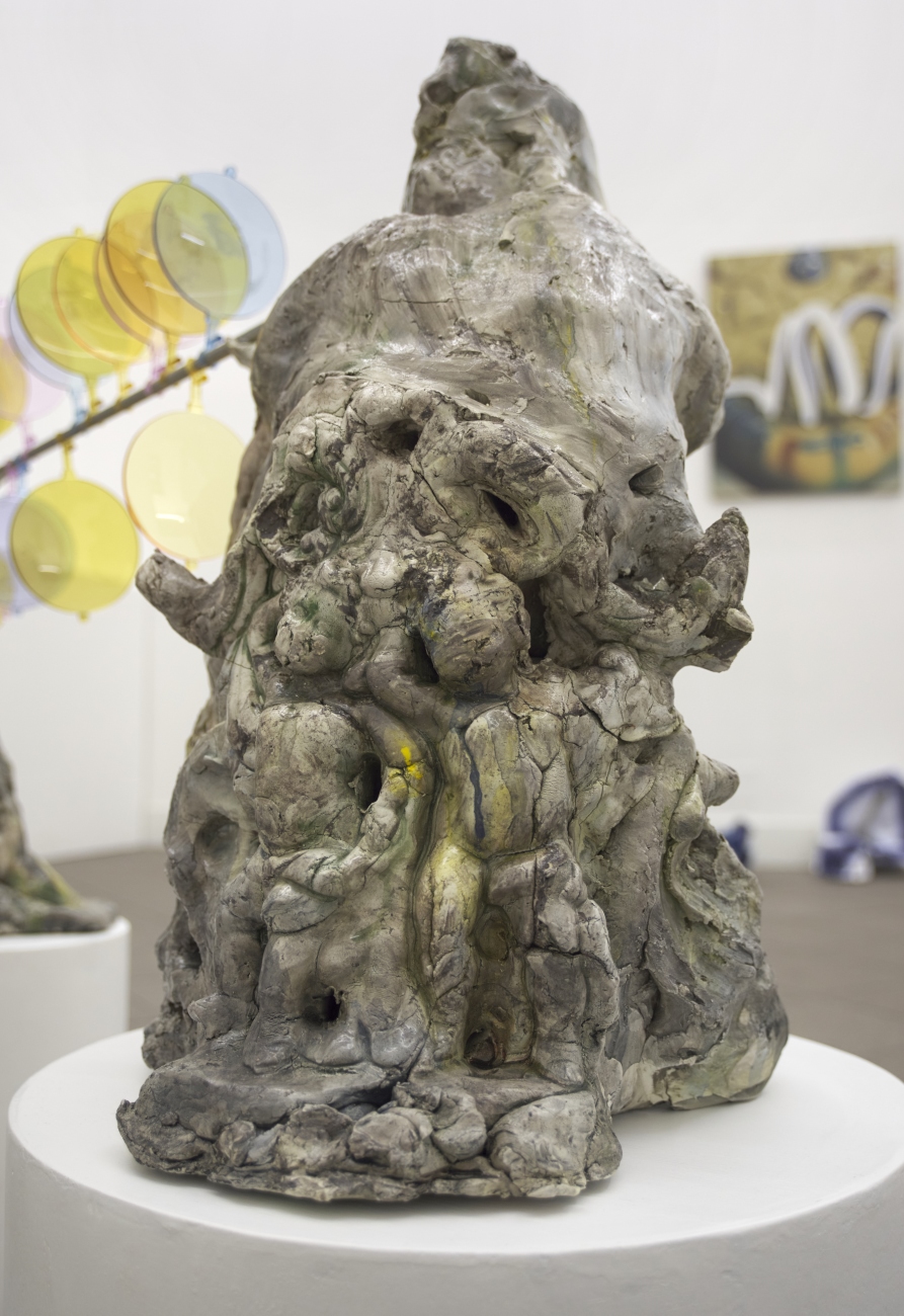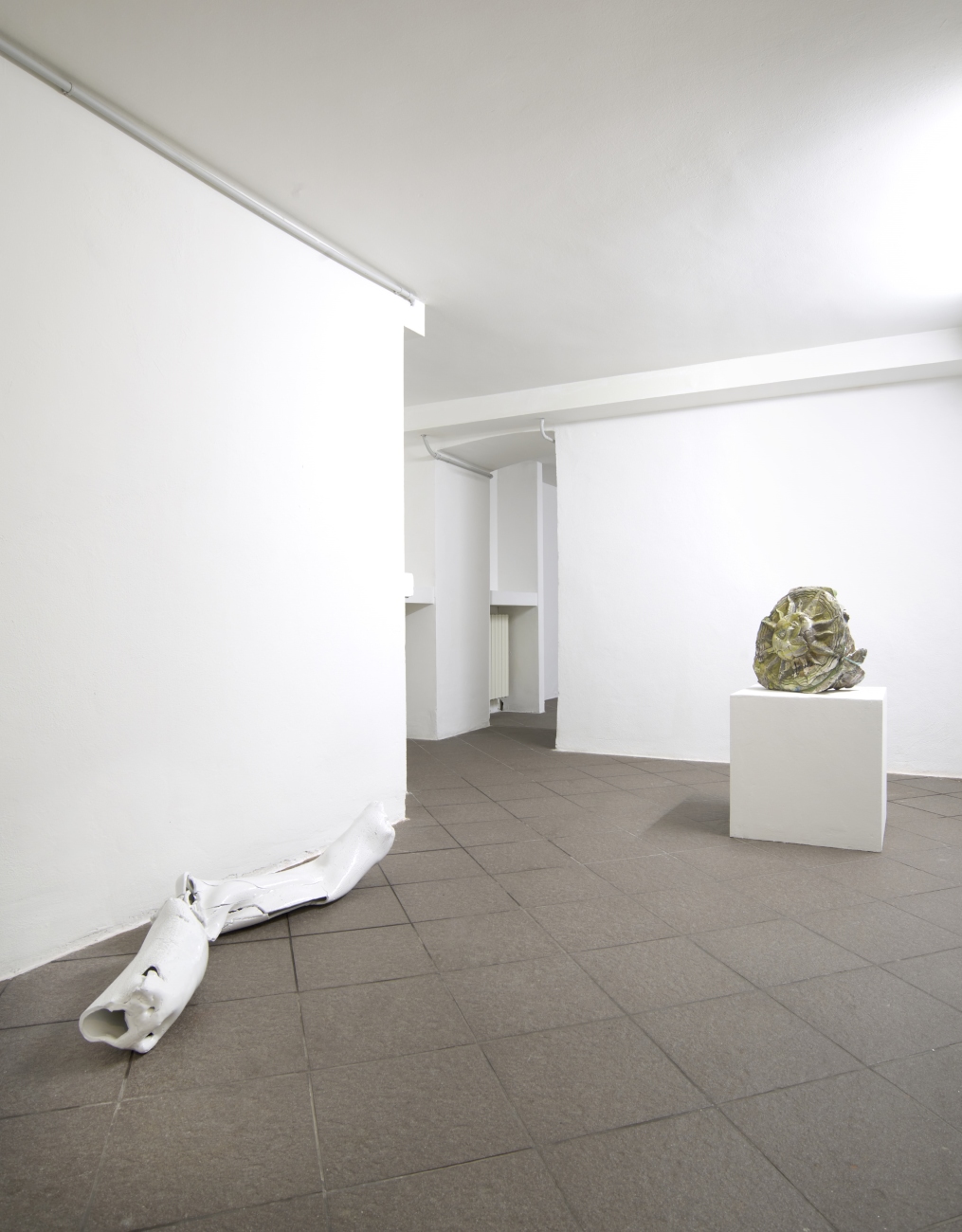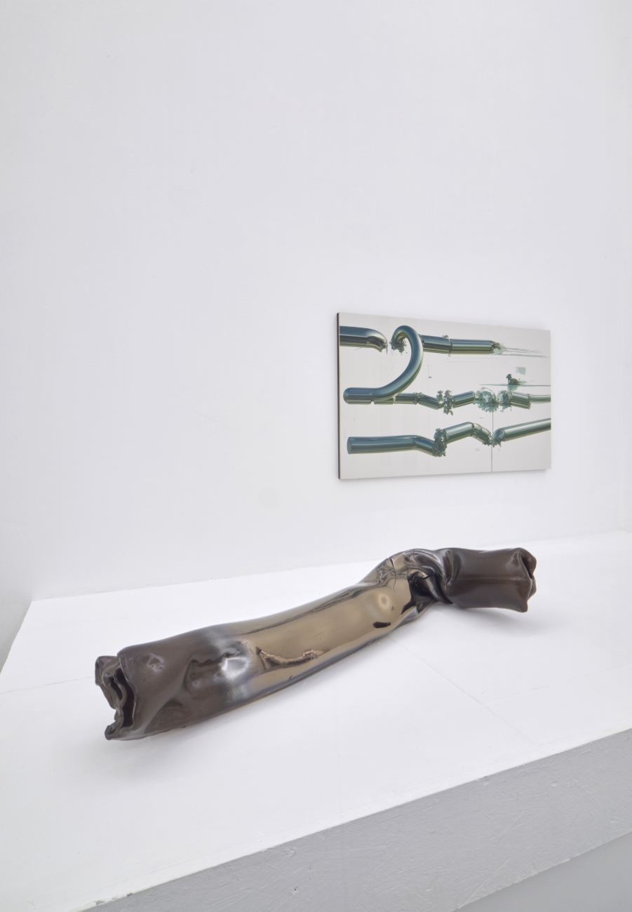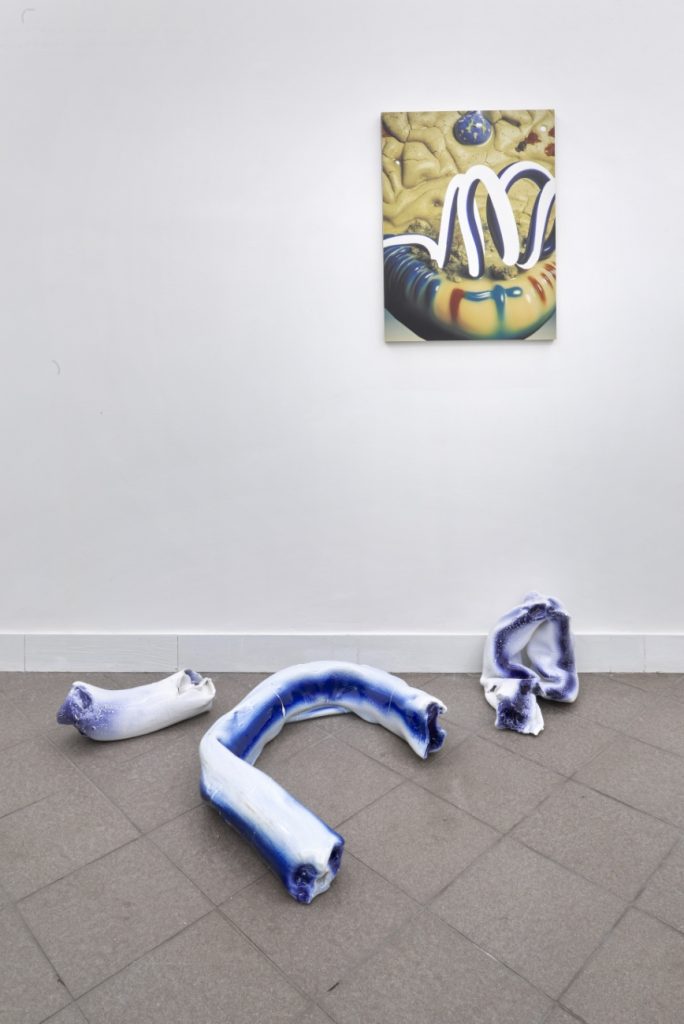 According to an antithetical demiurgic movement, the exhibition concludes with a descent, both physical and evocative, into a proto-vital condition. Fluid, visceral presences recall amniotic liquids in motion: viscous volumes surfacing and emerging from the earth itself. Ceramic castings and acetate forms share a metamorphic dimension, alluding to primordial organisms engaged in an evolutionary trajectory that reaches toward the forms presented on the upper floor of the gallery.