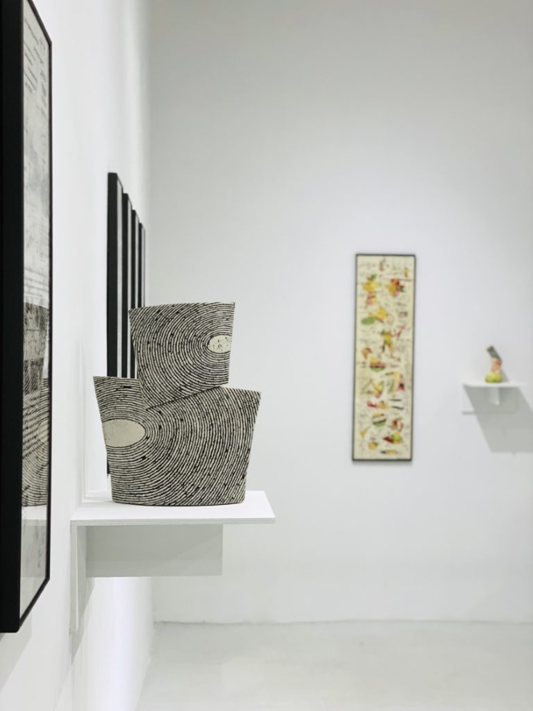 This exhibition brings together two artists and their respective passions for the ancient material of clay and the more modern practice of mark making on paper. For 39 years, Rosaire Appel and Robert Ellison shared both a home and a life filled with art and curiosity. For Ellison, this led to a lifelong pursuit of collecting, learning about, and making ceramics, as well as photographing and writing books about ceramics. For Appel, her experience with the limitations of the written word and its representation led to a practice of asemic mark-making in drawings, prints, and artist’s books, where the meaning is left up to the viewer to interpret, decipher, feel, and puzzle over. In their shared living space, works from the collection mingled with those created by Appel and Ellison, existing in regards to one another. This exhibition pays homage to that interaction, while also celebrating the discrete voices of these two remarkable artists.