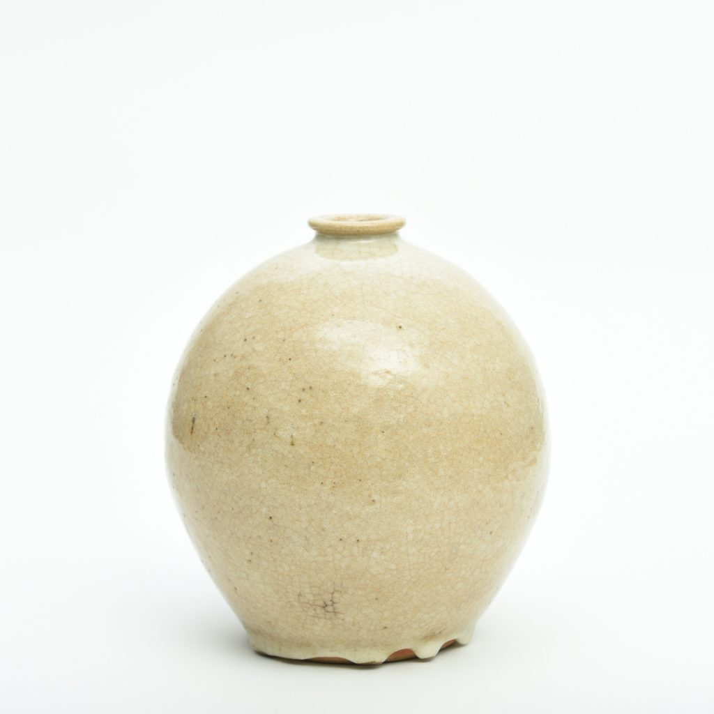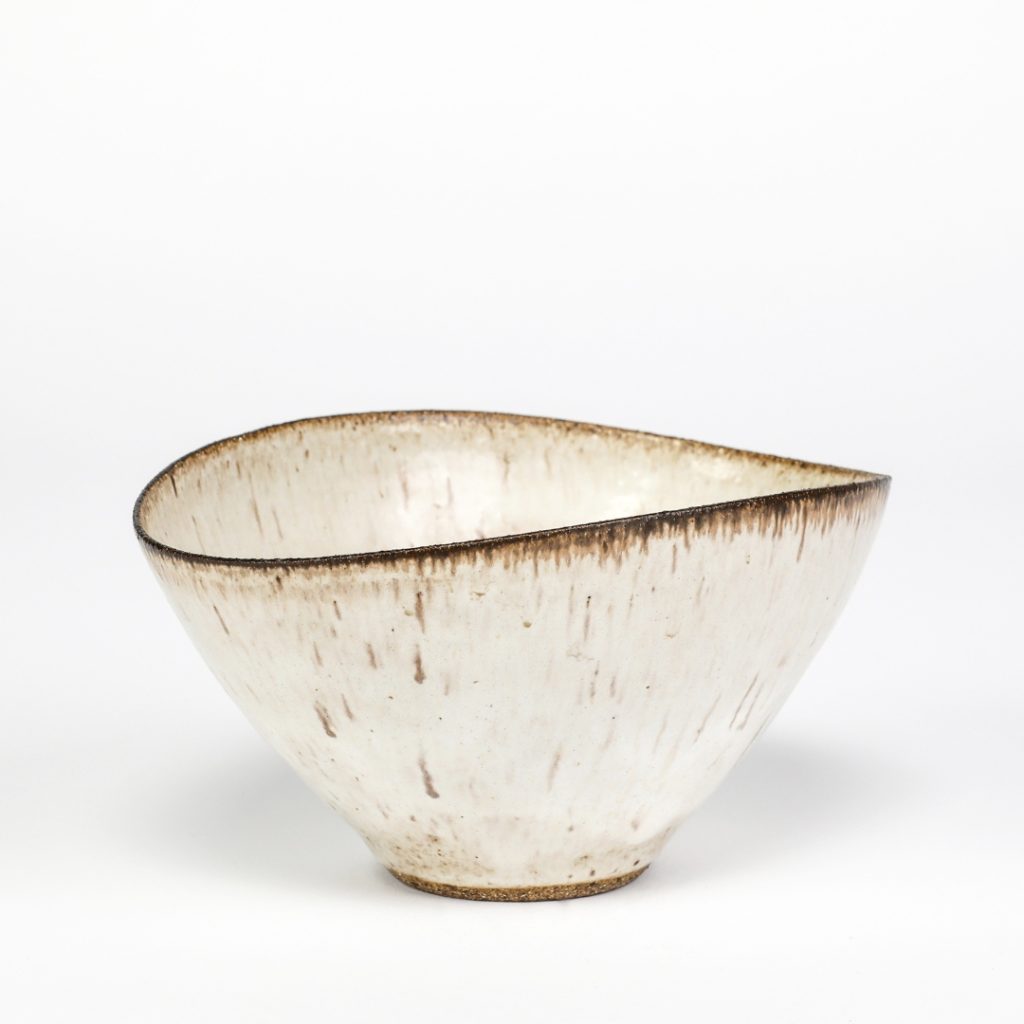 Contemporary ceramics are well represented by striking works from such artists as Ashraf Hanna (b.1967), Akiko Hirai (b.1970), Bodil Manz (b.1943) and Edmund de Waal (b.1964). Hirai’s extraordinary Extra Large Moon Jar, c.2000, is a museum-quality piece of grogged stoneware, presenting large rugged porcelain deposits over white and black slips under running pale blue and green glazes. The moon jar was presented at the Flow Gallery, Akiko Hirai Solo Show, 25 June – 15 September 2020, and it stands as a remarkable testament to Hirai’s vision, imagination and experimental daring. On a different scale, the delicate celadon crackle-glazed pinched and thumbed vessels for which De Waal is renowned are well represented, and appear at a timely moment – with the opening at The Hepworth Wakefield of Playing with Fire: Edmund de Waal and Axel Salto, a new exhibition which sees De Waal offering an interpretation of Salto’s artistic influence.