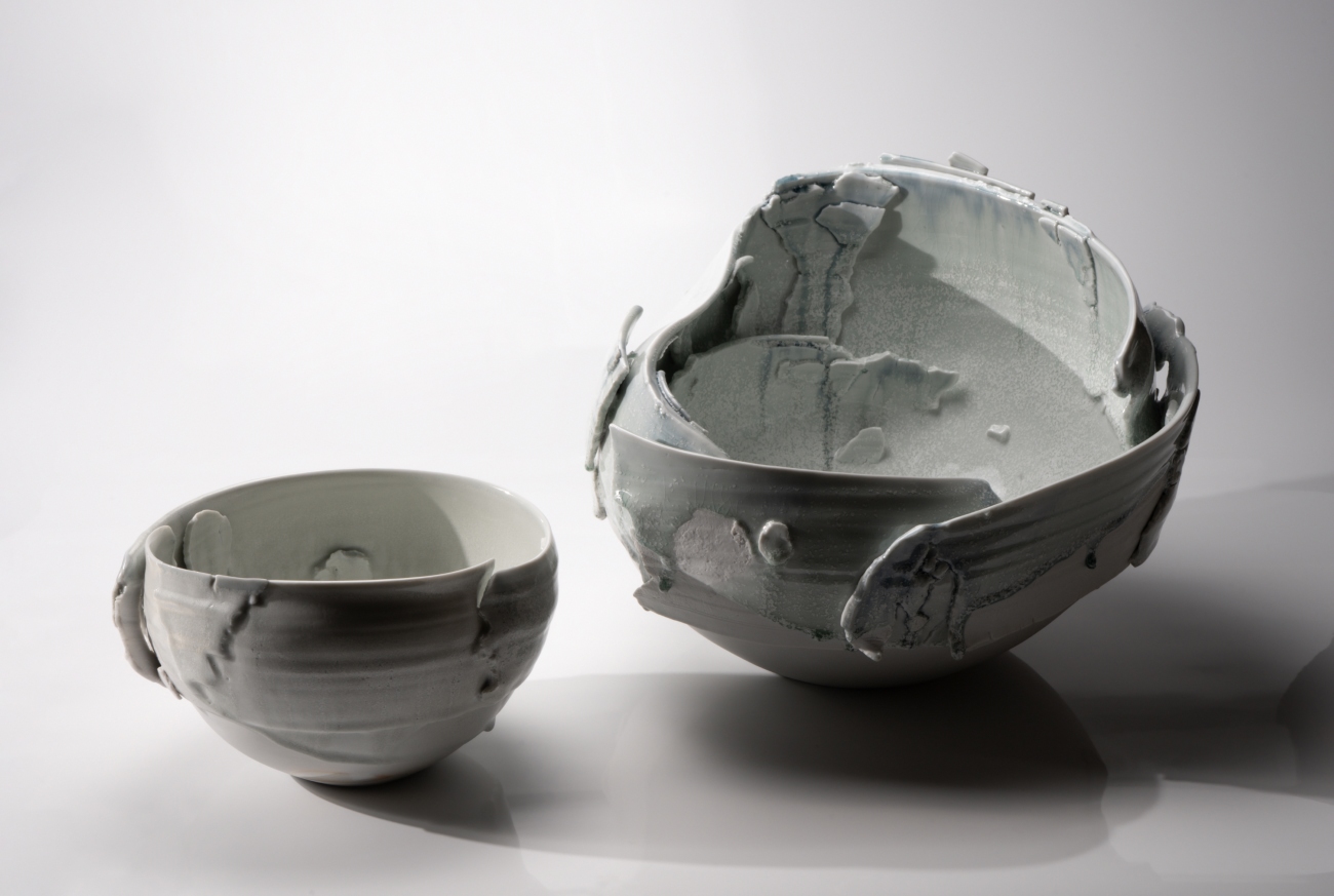 - Two works by Kato Mami #1, (Right) Gekka (Under the Moon) 1, 2025, Seto porcelain, (h) 29.5 × (w) 42 × (d) 39 cm / (Left) Bowl with Frost glaze, 2025, Seto porcelain, (h) 16 × (w) 22 × (d) 26 cm. Photography by Yoriko Kuzumi
