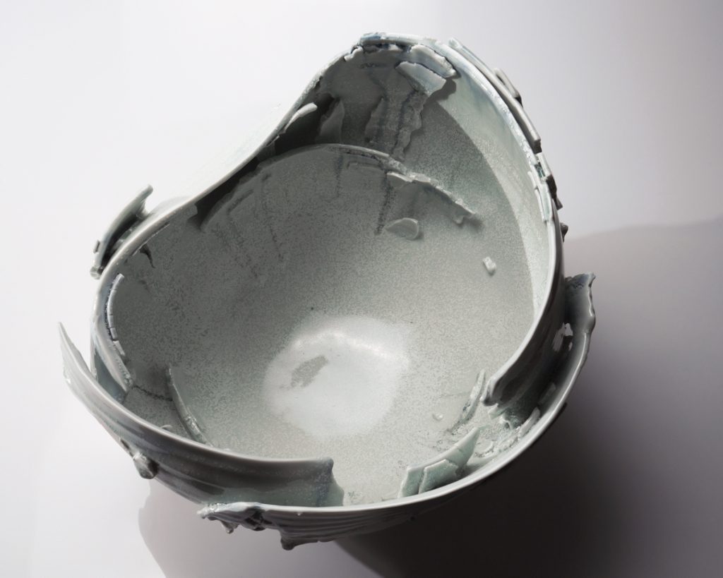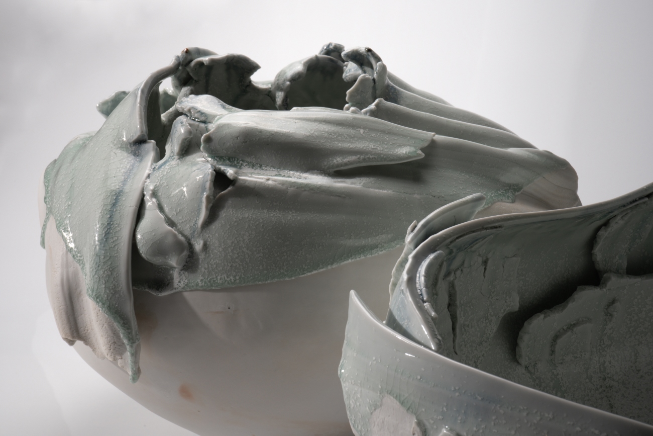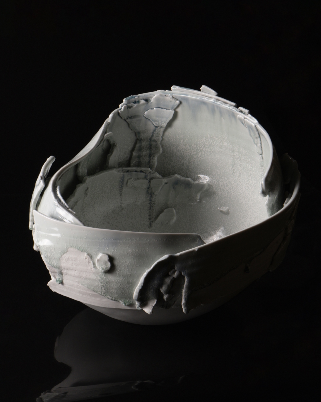 For Kato, this philosophy of interior presence also extends outward into form: the vessel’s “soul” finds further expression in textures and surfaces that invoke potent themes from the natural world. Working primarily with sheets of porcelain clay, Kato constructs sculptural forms that echo glacial terrains, quarried mountains, or oceanic tides. Her process is defined by formal tensions between sharpness and softness. Delicate slabs and ribbons of porcelain clay are layered, folded, and draped to achieve structure while still retaining organic fluidity. Under shifting light, the surfaces of her works comprise crystalline tones and dramatic, angular shadows that impart an ethereal impression on the viewer. Subtly iridescent glazes, in pale greens and blues, emerge through the matrix like glacial melt over porcelain, recalling distant and celestial terrains. The making is meticulous: hand-building, painting, glazing, drying, before finally firing in a gas kiln.