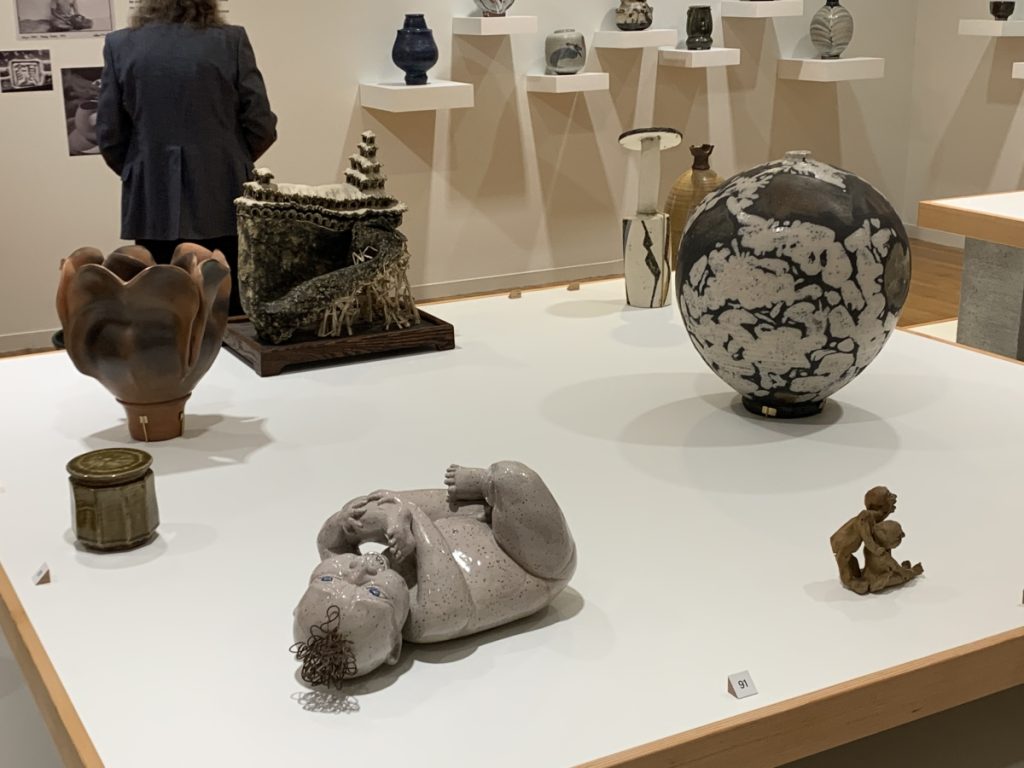 Around the periphery of the gallery are eight spotlight displays featuring the artists that Lawrence was able to collect in depth. These displays have been managed differently, using profiles of the work to show off form and glaze, with a short precis on each artist. The earliest studio potter in BC, Axel Ebring, had been trained in Sweden by his father and grandfather. He arrived BC in the late 1900s, and by the mid 1920s established his first pottery in the interior of BC. It is hard to convey to those outside of British Columbia, the type of terrain, the isolation, and the challenges this location would have presented in that era. There were no commercial or traditional ceramic resources whatsoever, and a drive to Vancouver, the closest sizable city, 450 kilometers away, in a cart or car, would have taken many hours, even days, hampered by broken wheels or flat tires, in unpredictable weathers, and on questionable unpaved, and scary mountain roads. Ebring had to find and manufacture all of his own materials and tools, so he located his workshop near clay and mineral deposits. Another notable aspect of his practice is that he was well established long before the pervasive Leach/Mingei and Modernist influences, especially those from post WWII to the 1970s, had infiltrated much of the studio pottery of the Western world. Consequently, his handsome, vintage forms and lustrous glazes, many of which are lead based, do stand out. In contrast, the pottery of two other spotlight artists, Ontario born, John Reeve, and British Columbian, Charmian Johnson, both Leach apprentices and acolytes, are all about interpretations of Leach/Mingei. The pottery of Wayne Ngan, who arrived in Canada at age 13, elegantly moves through an intersection of influences – Asian, Leach /Mingei, and Modernism. Laura Wee Láy Láq, one of BC’s earliest Indigenous ceramic artists, of Stó:lo (Coast Salish) and Wuikinuxv (Oweekeno) ancestry, focussed on organic form, using coiling, burnishing and pit firing to beautiful and meaningful effect. Albertan, Walter Dexter, who trained in the prairies with Luke Lindoe, and then in Sweden, and Vancouverite, Kathleen Hamilton, both demonstrate the influences of modernist rigour and Scandinavian design. Thomas Takamitsu Kakinuma is represented by his much -loved animal figures. Kakinuma arrived from Japan, in 1937, but it was in the 1950s he acquired his ceramic skills, in both Ontario and at the Ceramic Huts at the University of British Columbia.