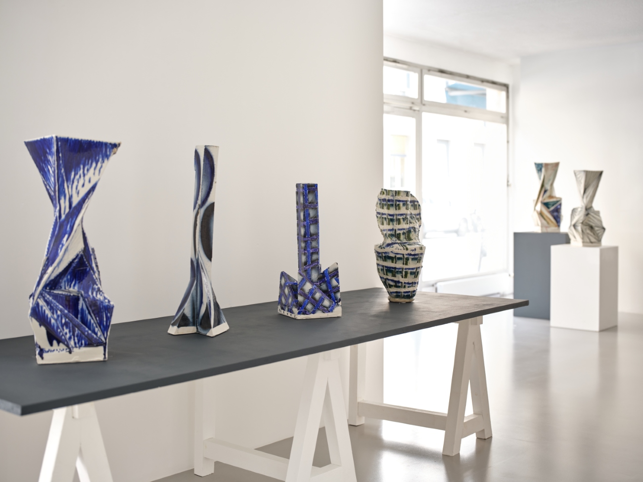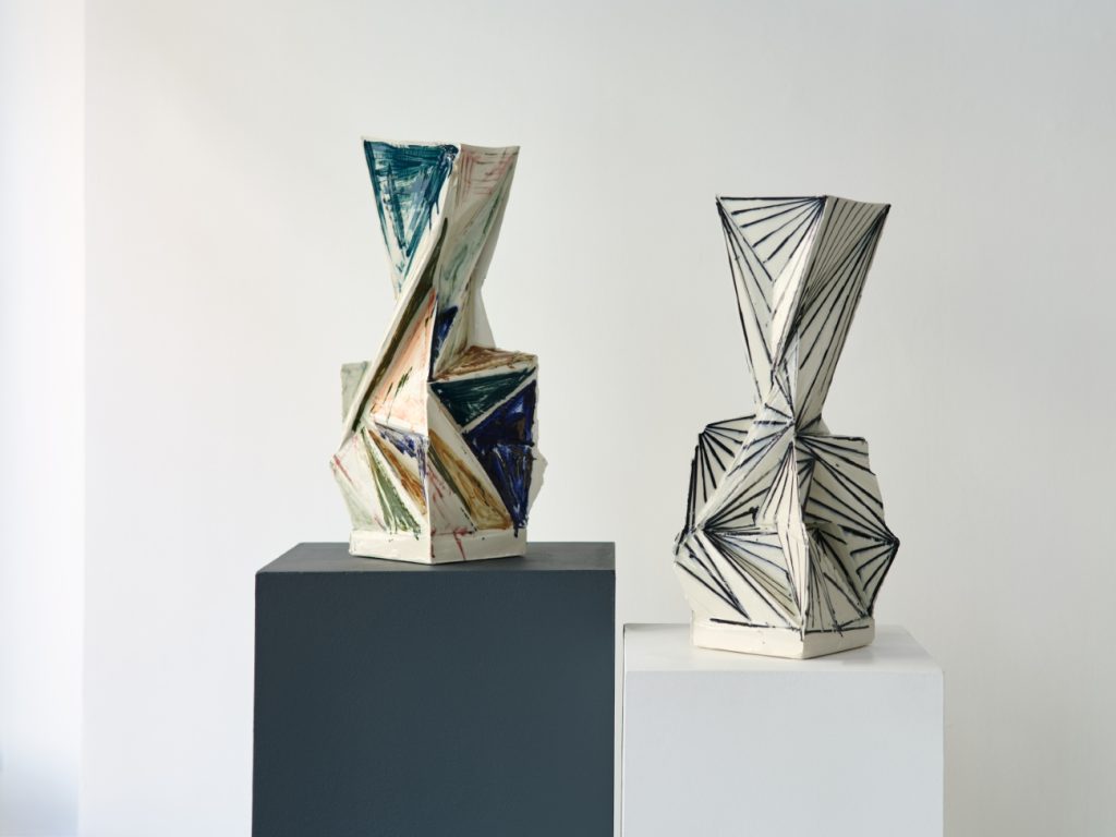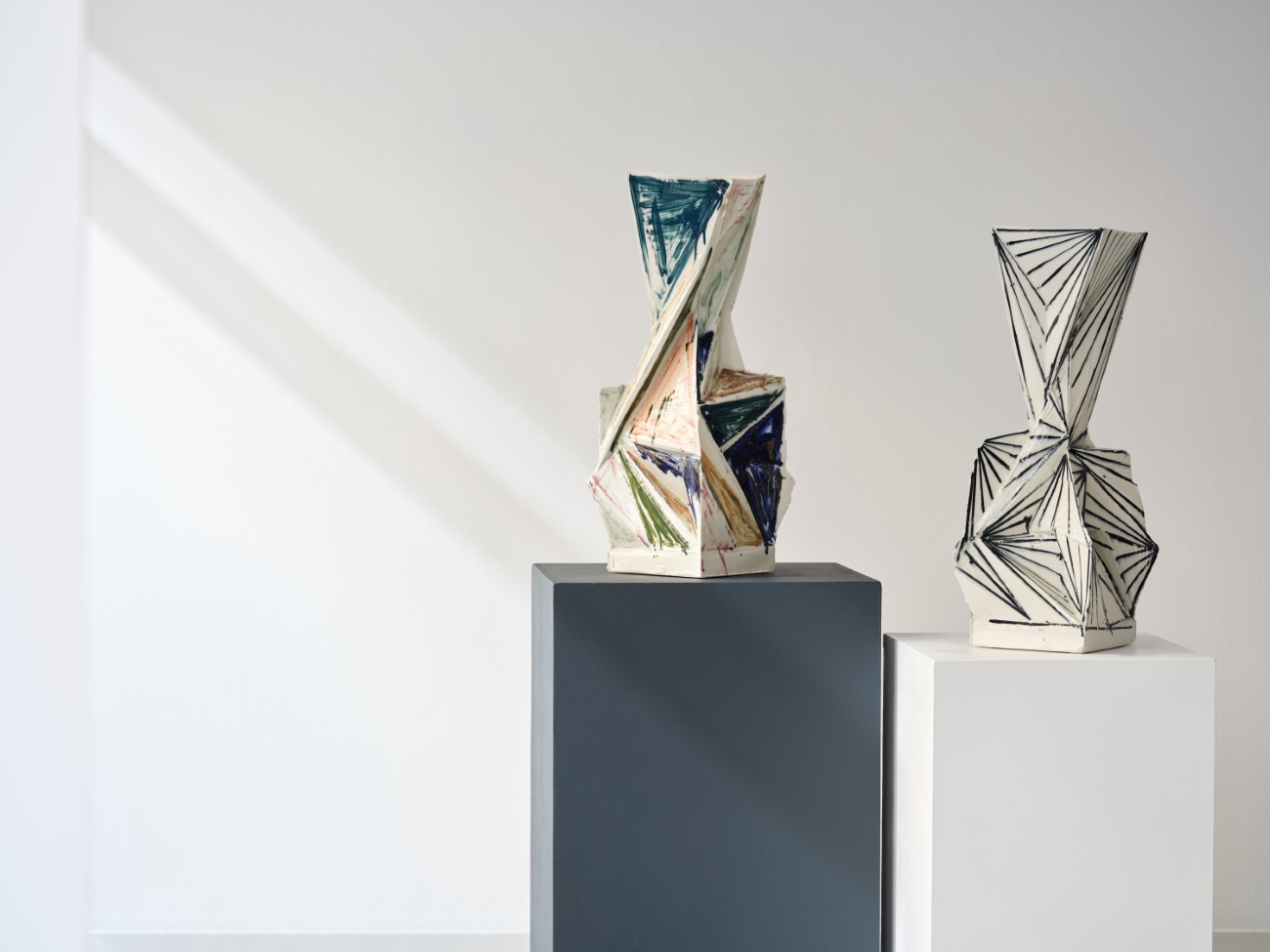 Irregular cubes, triangular planes, sharp edges and mostly square, funnel-shaped necks characterise the Cuts. Here are the plaster moulds—cut, sawn, or otherwise worked—that generate the cast forms. Their silhouettes are often accentuated by coloured lines—cobalt blue, for example—that visually tie them together. On certain triangular facets, lines converge toward a central vanishing point, heightening spatiality and multidimensionality and imparting strong dynamism. Glaze and colour play a significant role: when glazed in a single tone—celadon or pure white, for instance—the forms and their constructions read with great clarity. Triangular planes with a crystalline quality are often finished in solid fields of colour. In the Cuts, the vessel character—still associated with many of his works—comes strongly to the fore. In the Geneva exhibition, the Cuts also take on the air of abstract architectures.