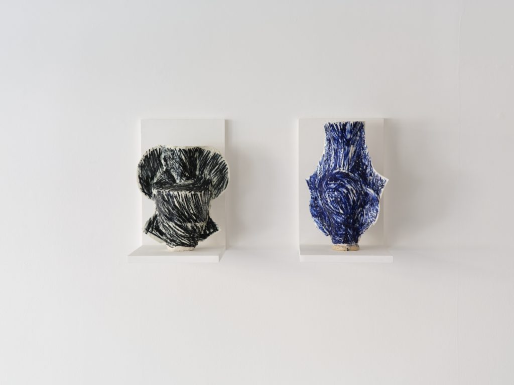 All the works are made from porcelain body using a casting process developed by Nagel. Formally, the aforementioned “sacrosanct trinity”—non-perfection in ceramics, Bauhaus clarity and geometry, and Abstract Expressionist individuality—is reflected in the pieces on view.