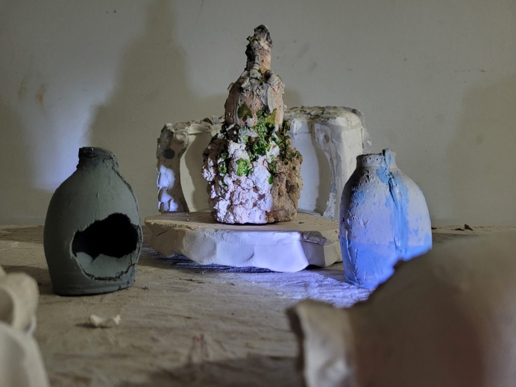 Varied materials such as clay, plaster, a dead plant, branches, Earth, Ceramic bones, snails, stones. The words in poetry, performative improvisation, nonsense, the animal, the sensation, the ritual, the non-representative. Everything appeared and brought new questions about life and death. A laboratory of meanings that exchanges the poetic and the scientific. Lights and shadows, ceramic minerals, work processes that poetize what nature does with matter in a journey without origin or end. (photos 1 – 3)