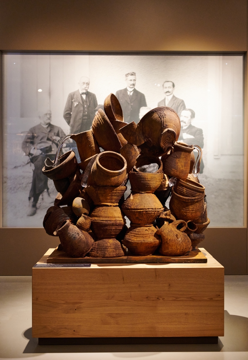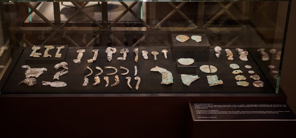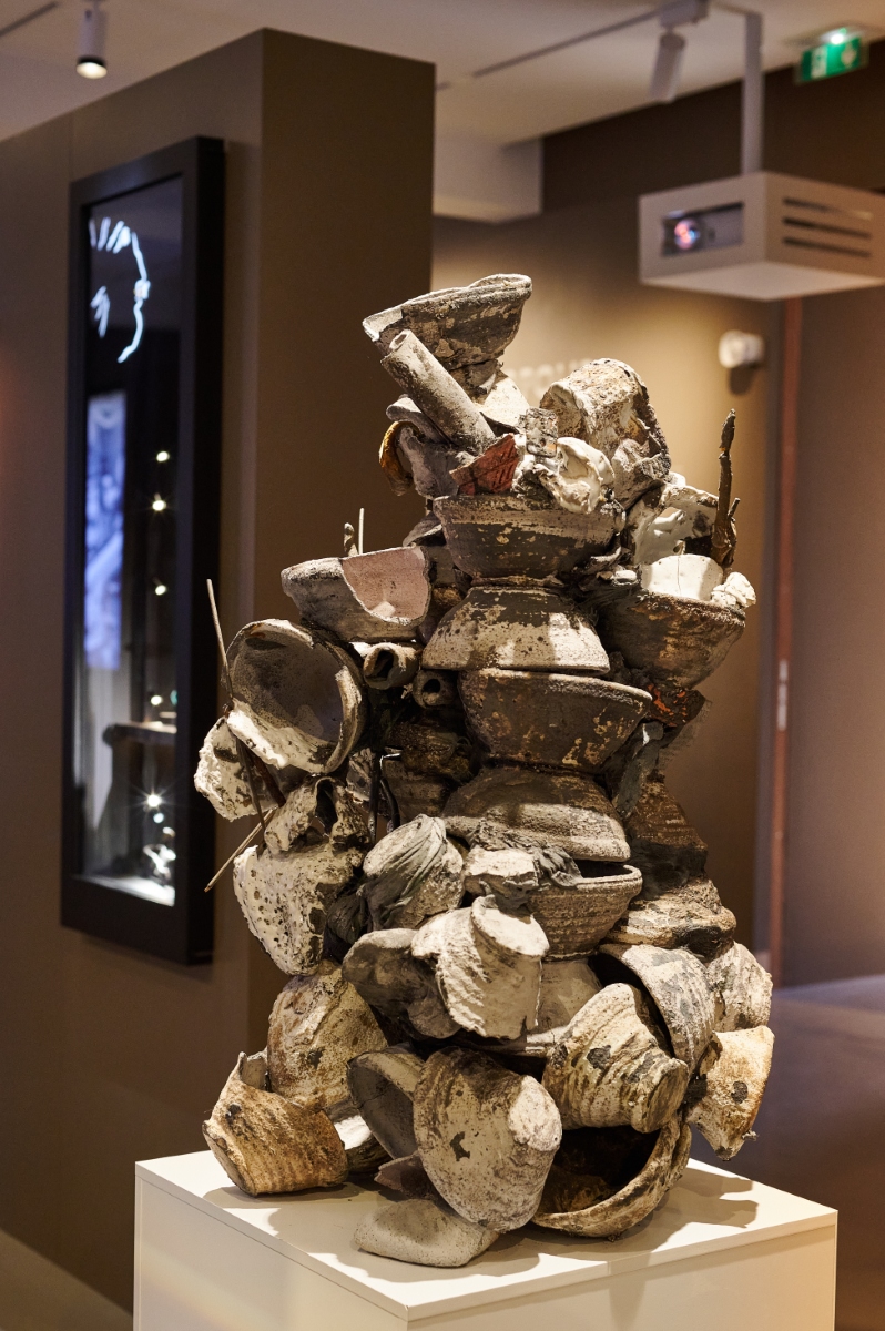 The exhibition is deliberately divided up between the main temporary exhibition room and the rest of the Museum, with here and there the installation of different monumental assemblages echoing those of the Museum, while throughout the different rooms small poetic proposals are set in showcases. Elsewhere, the artist places sculptures that cleverly take up the theme of the contents of the showcase, which he is only temporarily replacing. This is indeed his project, first to confound the gap of centuries and then to put the spectator before the obligation of a real commitment to his own perception, to decide where the value really lies. Is this carefully preserved and restored everyday pot from some two thousand years ago really more interesting, more culturally charged than this ceramic can that could be unearthed in the distant future?