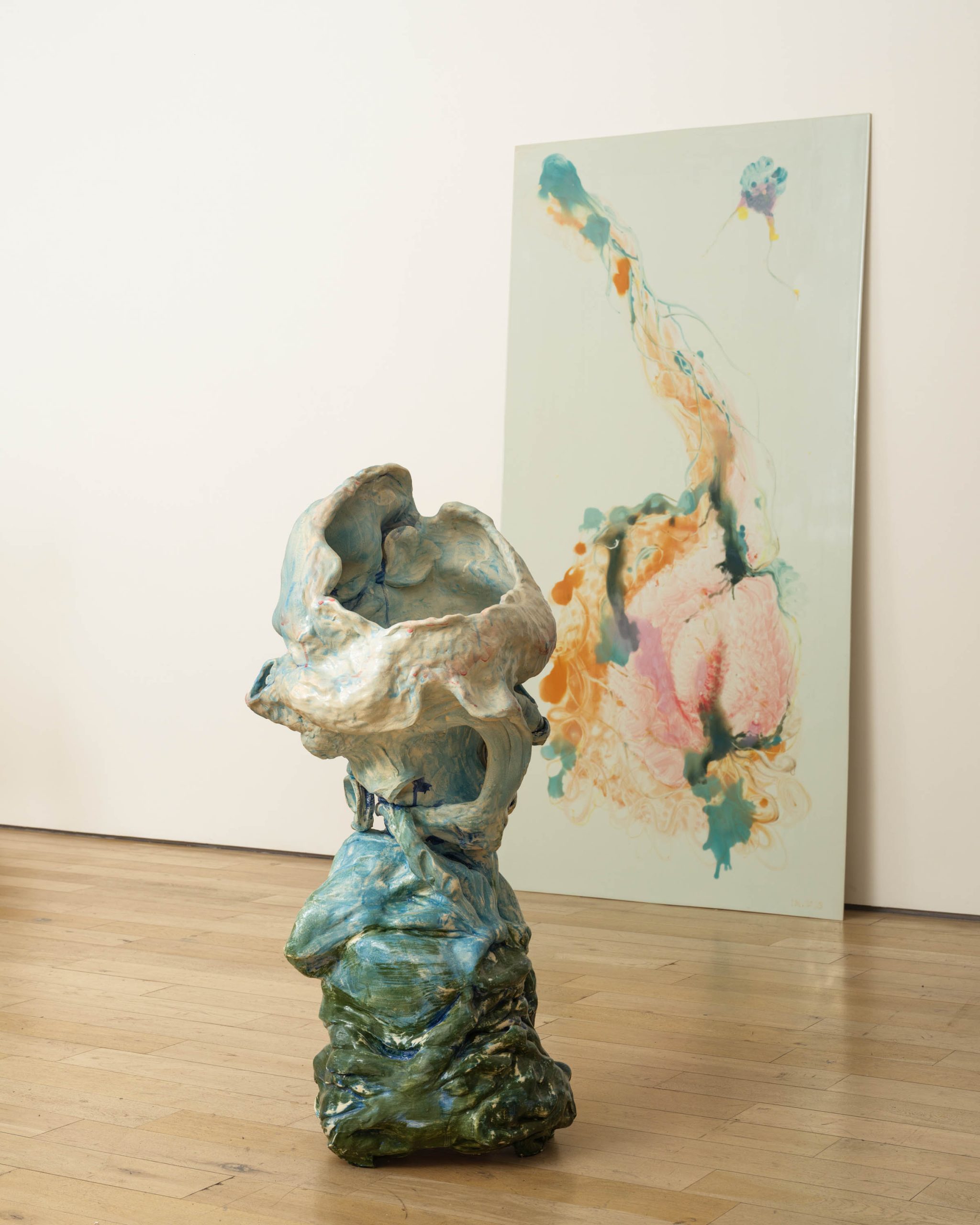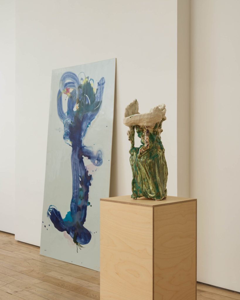 The result encompasses a particularly hallucinatory form of perception, not unlike the endless barrage of media cohering and dispersing. Nordli’s formal iconography folds and unfolds, stretching elastically as though under the pressure of centrifugal and centripetal forces. Offsetting the cacophonous agitation of her vessels, Both Sides Now also features a series of monumental porcelain tiles produced in Jingdezhen, China, and later glazed in Norway. Treated with painterly oxides and glazes, they provide a moment of respite, open-ended and vibrantly decorated. Like portals or thresholds, they distill the movement of the three-dimensional works in whirling vortices and fluid bursts of gesture set against the empty blankness of a flat plane of porcelain.
