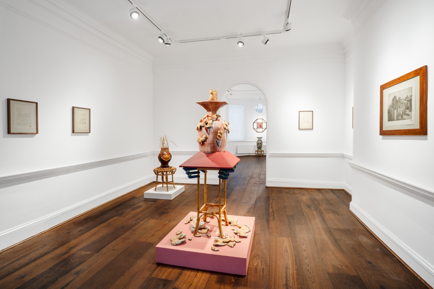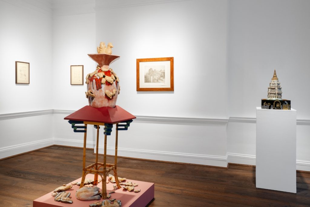 Exhibition highlights include: The Headless Guardian, a totemic assemblage sculpture that reflects on the enduring presence of sacred architecture and the illusory nature of change; Pot Luck, a sculpture inspired by a traditional Chinese Cheongsam dress, that reimagines the garment as an artefact to explore how clothing shapes identity; a limited edition aquatint produced exclusively for this exhibition; and works created during the artist’s Decorative Surface Fellowship at the City & Guilds of London Art School, debuting for the first time. These pieces incorporate techniques such as faux bois, gilding, and japanning – historically cross-cultural crafts that Poon reinterprets for a contemporary context.