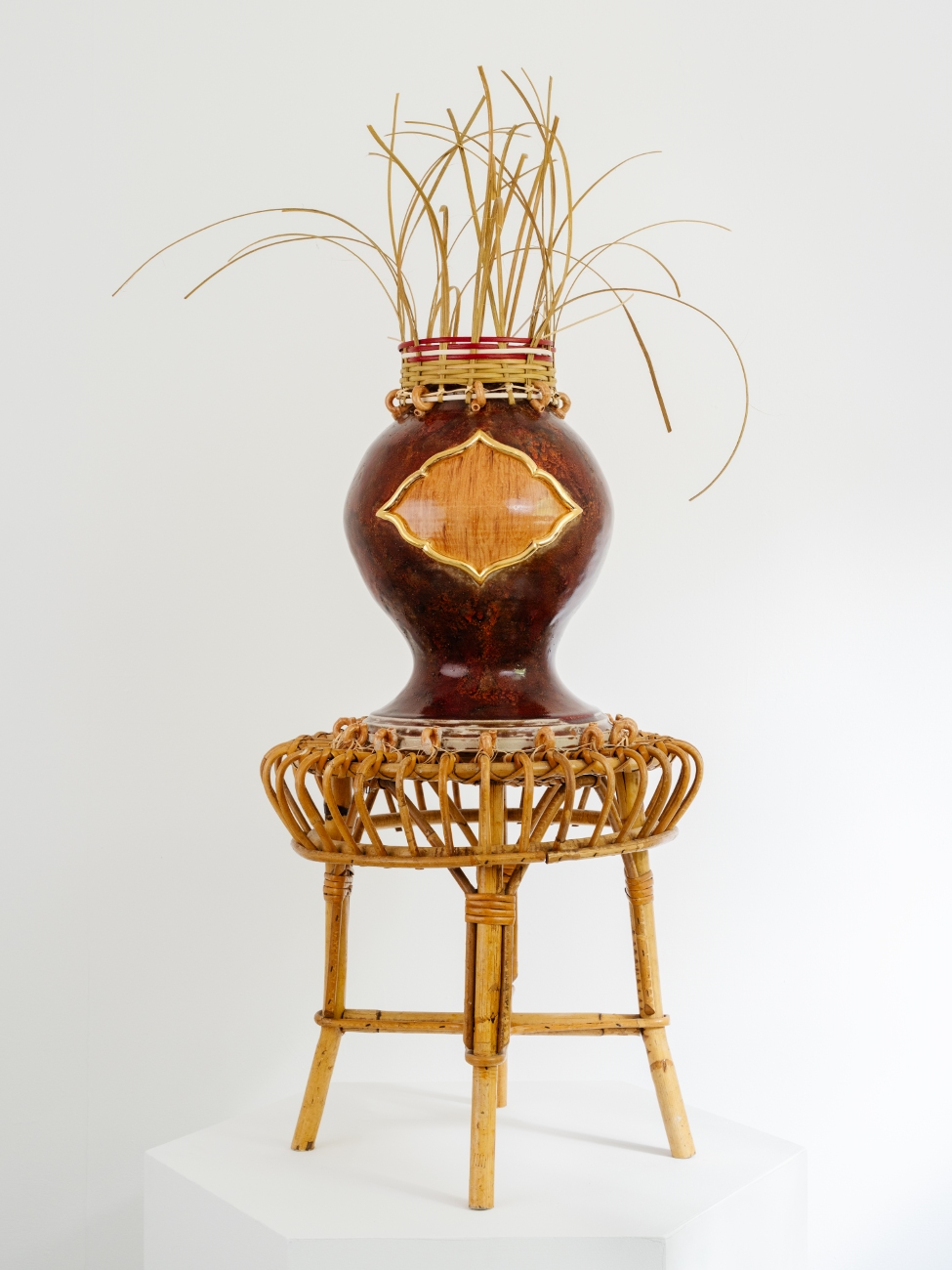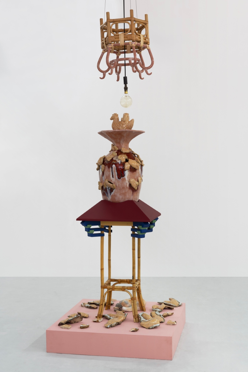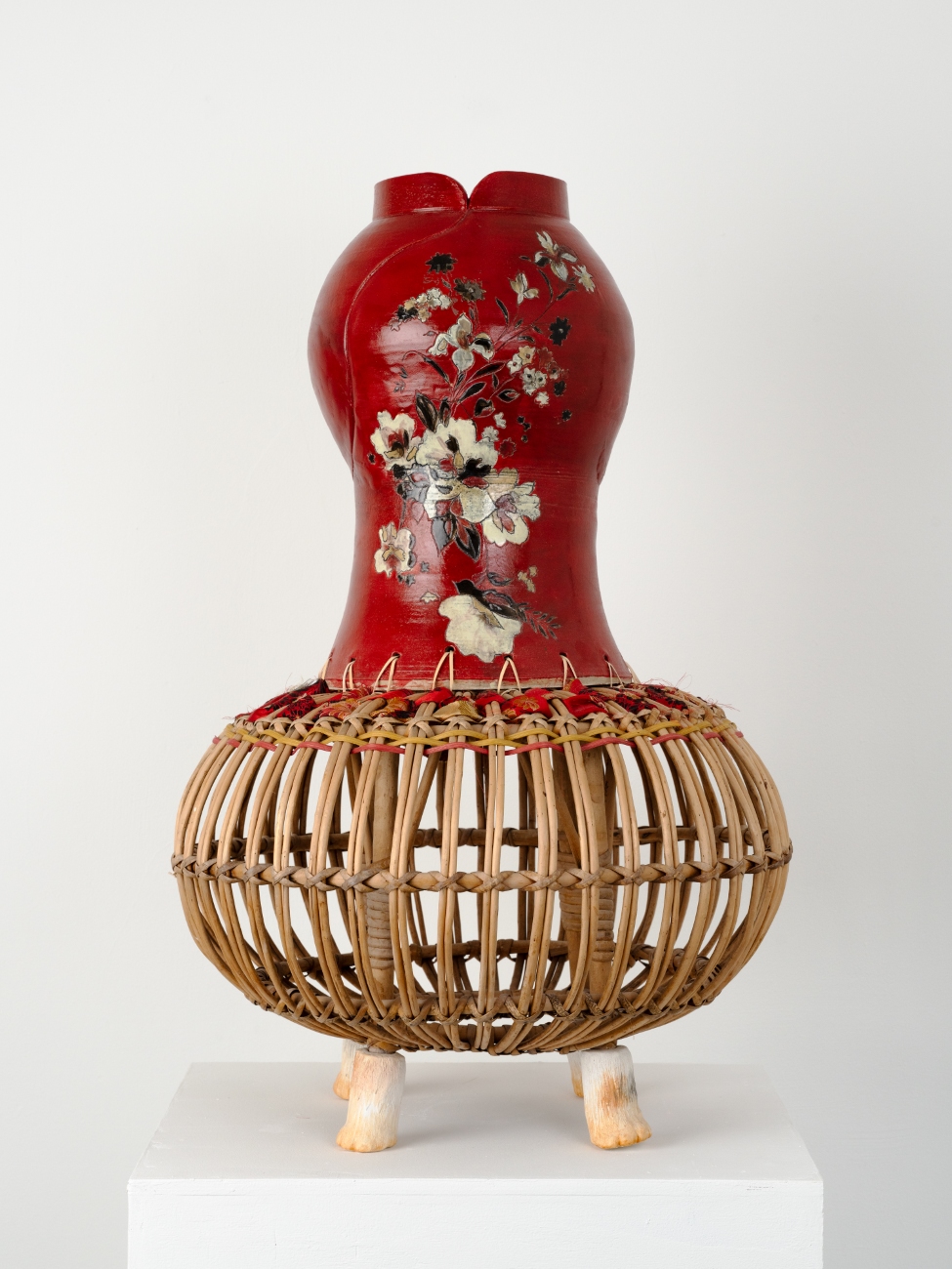 The artist examines Chinese culture through a distinctly Malaysian lens, animating her sculptural pieces with hybrid animal figures drawn from the iconography of Penang’s temples, alongside motifs inspired by everyday objects such as roof tiles, lightbulbs and dressing room mirrors. Her large-scale sculptures draw structural support from found furnishings in rattan and bamboo: materials traded between Malaysia and the UK during the colonial era, which remain commonplace in households around the world.